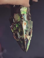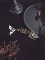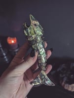 6.5 in. This is an antique bottle opener that is metal with shell all over it. It has a whole at its tail so you can wear it as a necklace if you wanted. It is missing a couple scales, not super noticeable. There's two on the bottom, one on the top and on the other side one on the very bottom. See pictures