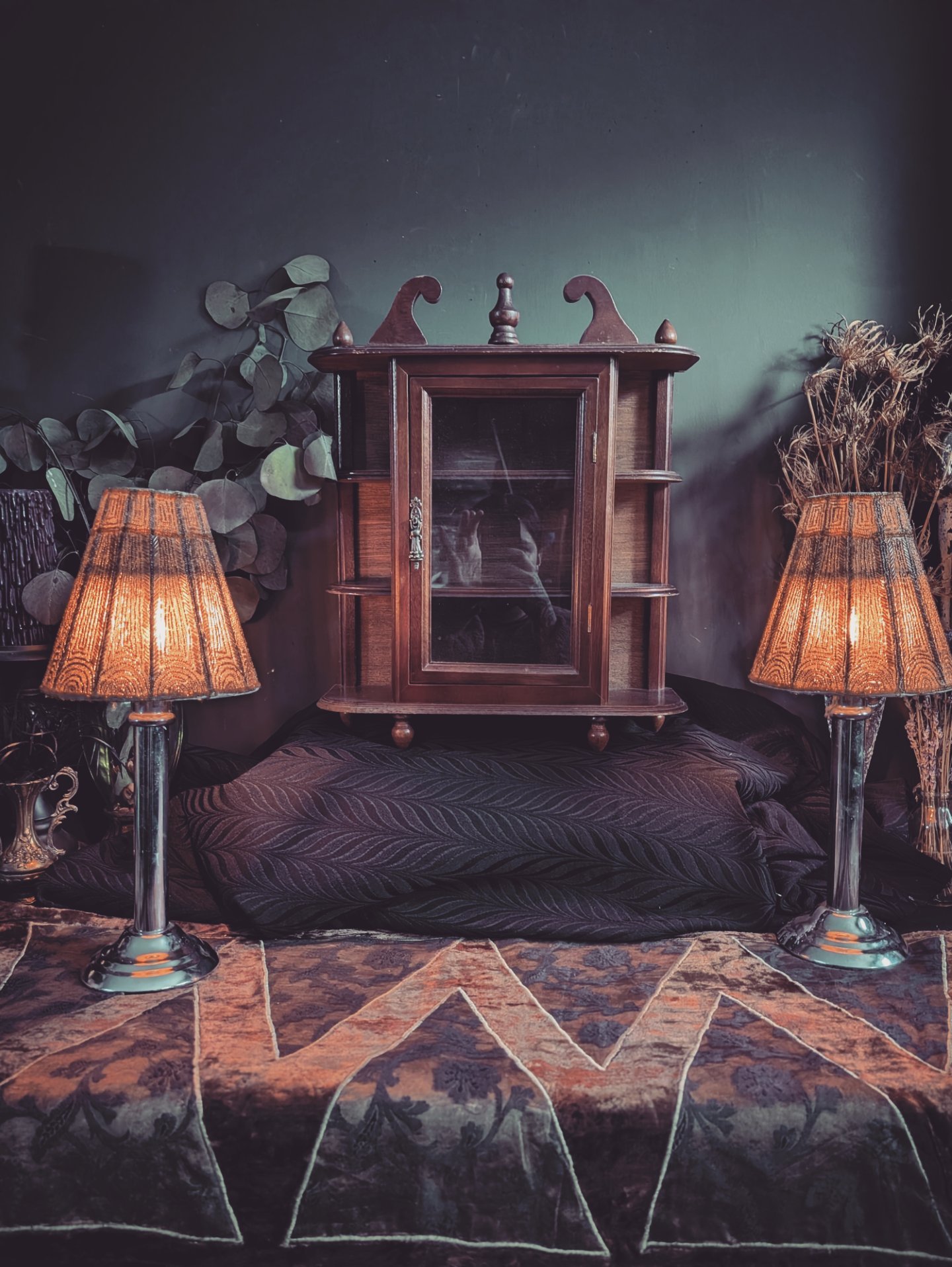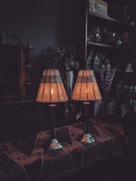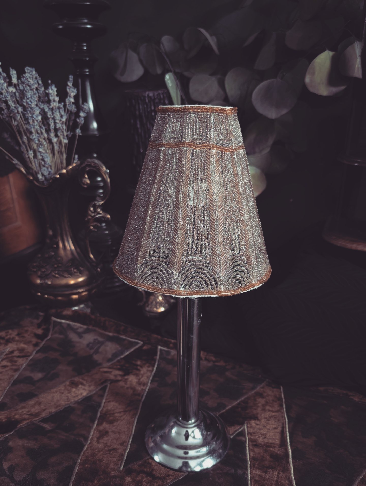 Each lamp measures 15 in tall. The lampshades are not attached. The shades are these beautiful antique hand beaded shades. They look silvery but if you look close they're actually gold so I think they're pretty neutral and could go with anything.