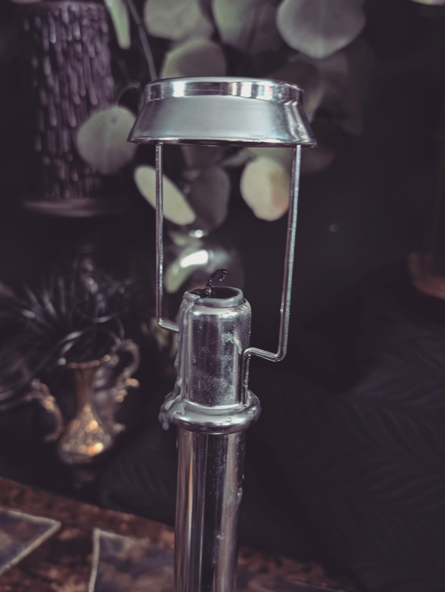 The candle parts are metal, aluminum, what you do is you screw the top part off and there's a spring inside the stick so you can shove a taper candle down there (I had to shorten this one) and as it burns it raises. I will include these candles but you can cut down tapers and stick them in there to refill.