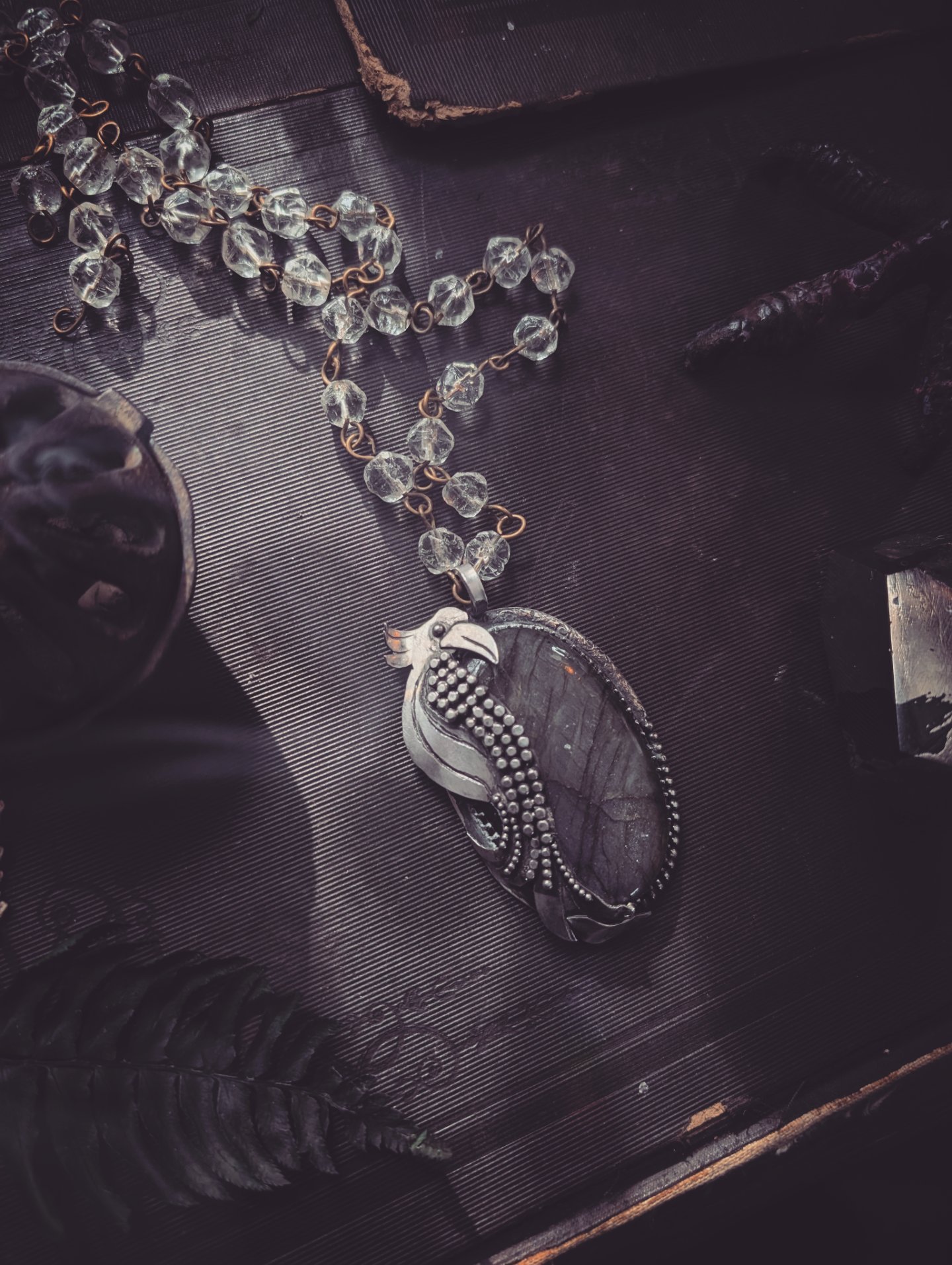 3 in tall x 1.75 in wide. This is a pretty heavy piece that needs a sturdy chain. I paired it with this antique crystal chandelier chain, made from faceted glass beads and brass. 24 in long.