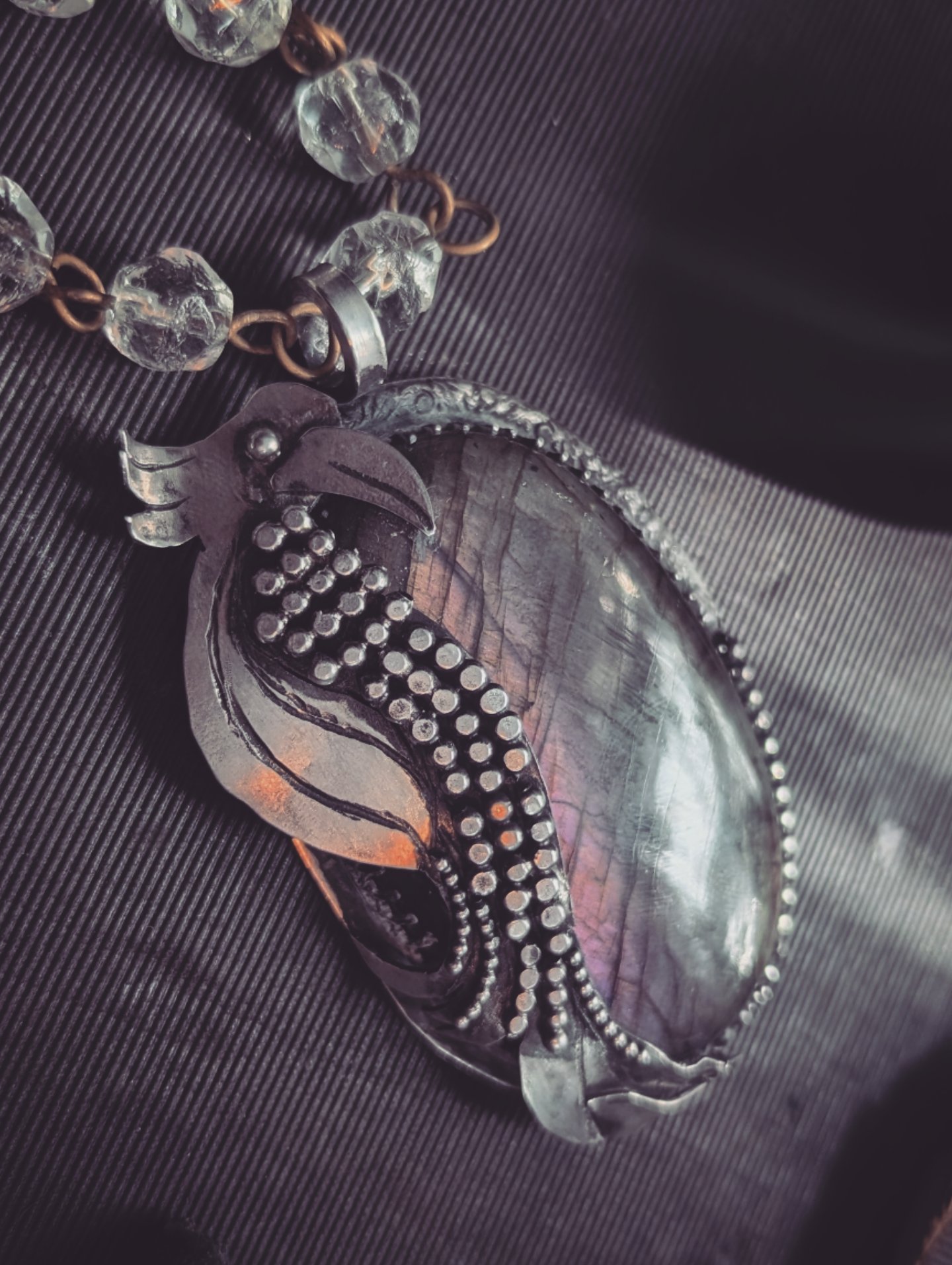 This is a handmade one of a kind piece. A huge pink/ purple labradorite sits in a sterling silver setting with sculpted bird detail that shimmers like small stones.