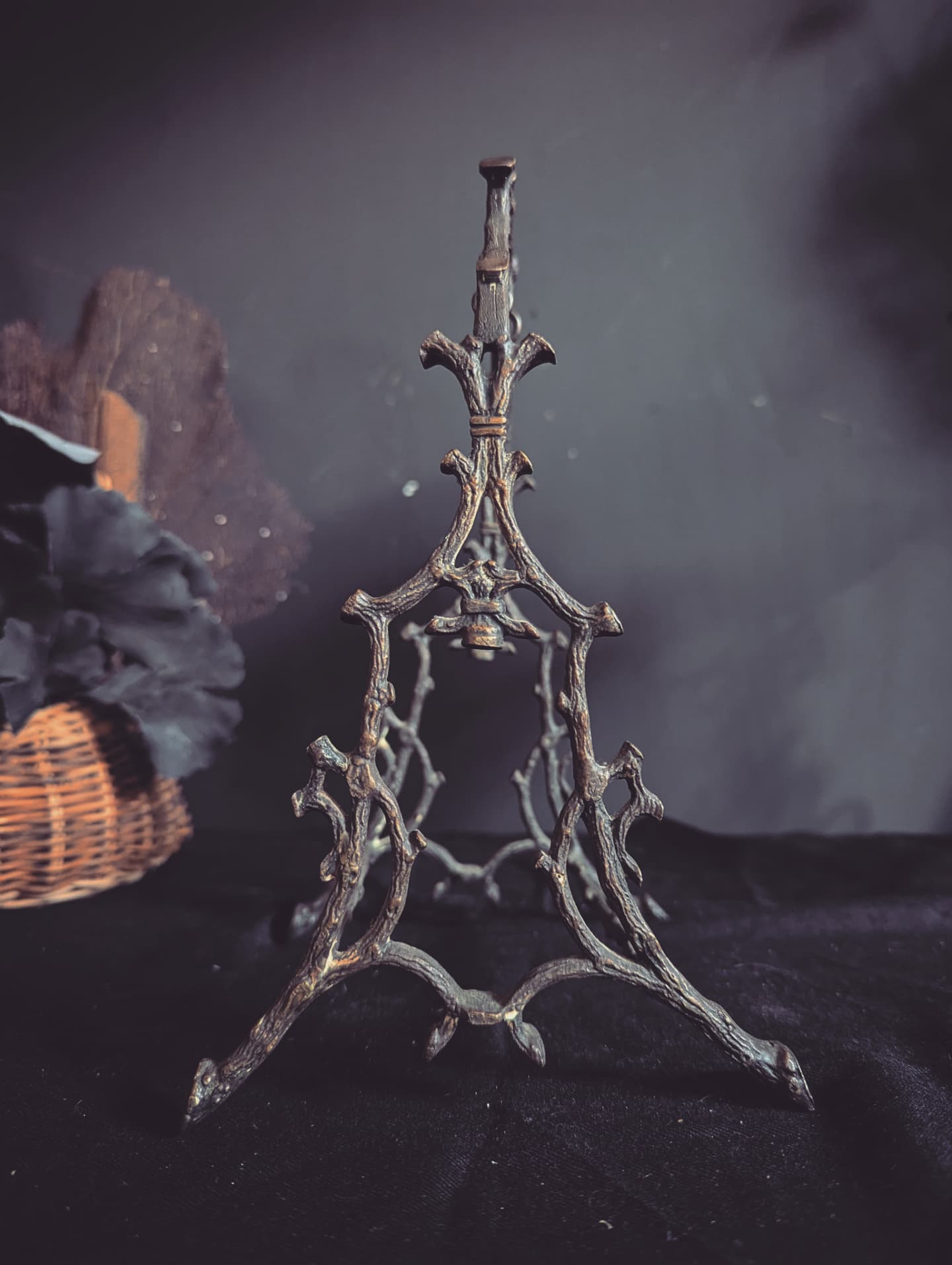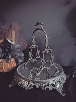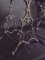6.5x5x10 in. Victorian piece made of heavy metal. Brass. Has little hooks at the top. You could hang whatever you want there.