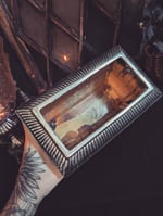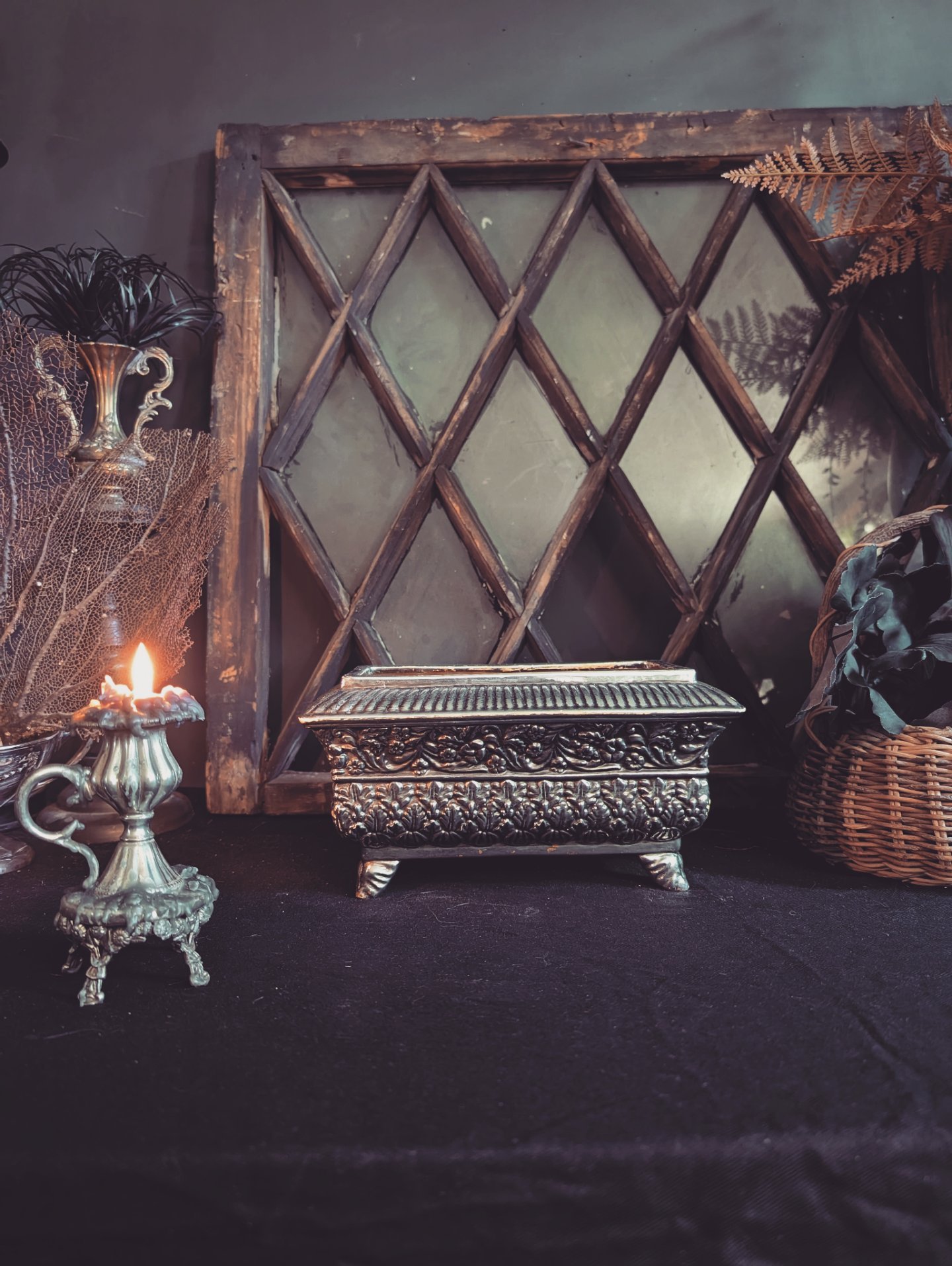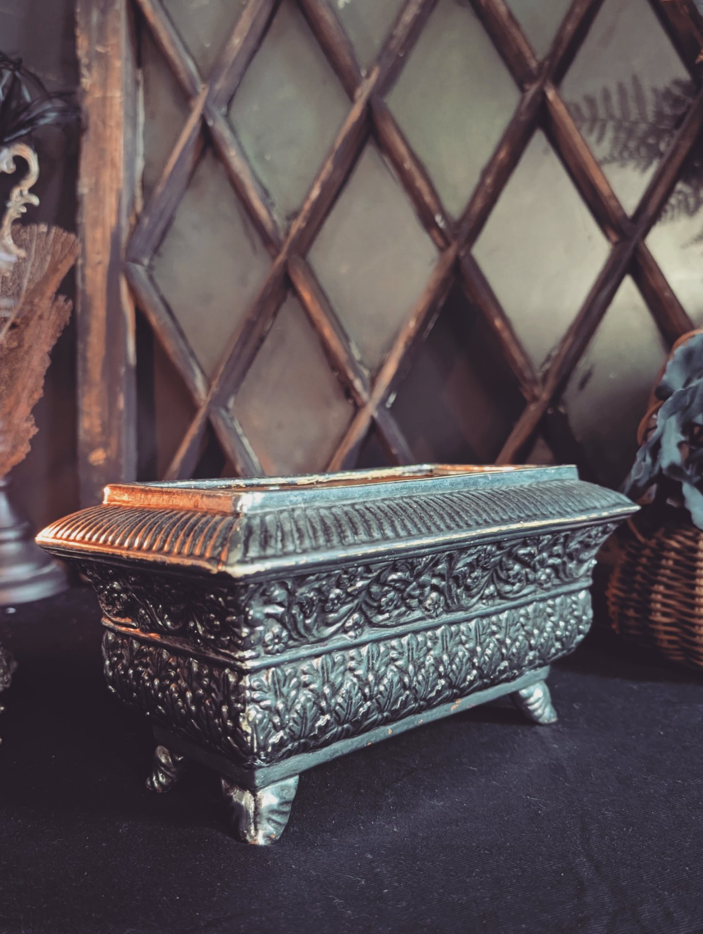 5x5x9 in. Porcelain. Looks like metal! A few little paint chips