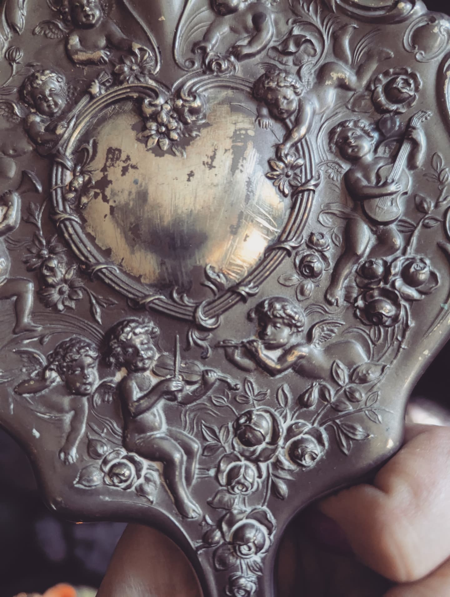 Antique silver plate. Has some tarnish and wear but is in good condition. Measures 9 in