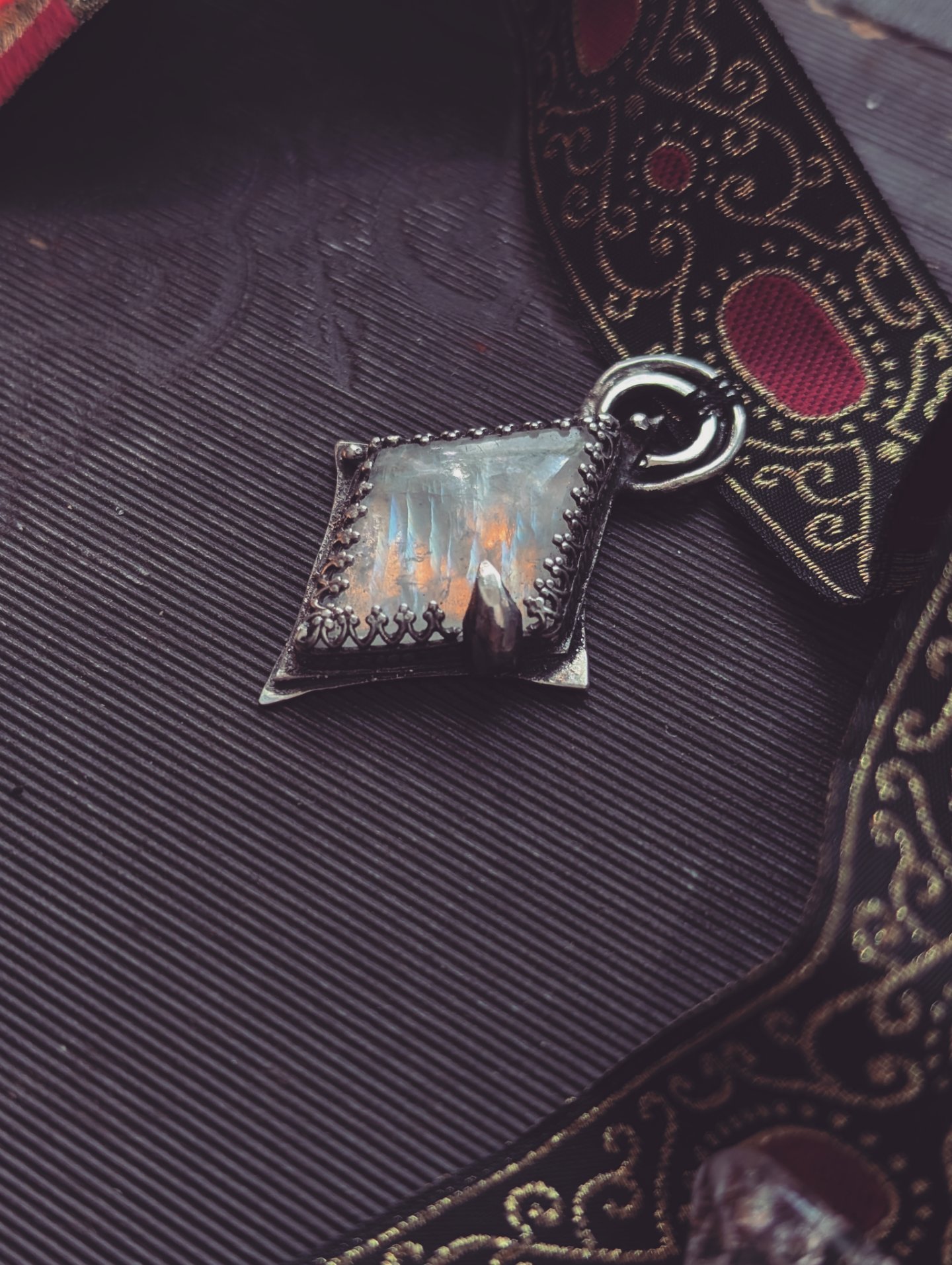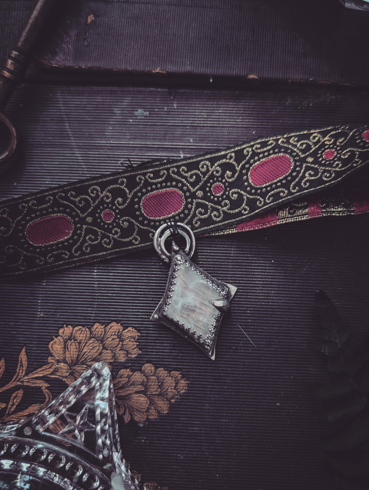 this sterling silver piece is handmade and one of a kind. It is stitched to a vintage ribbon choker.