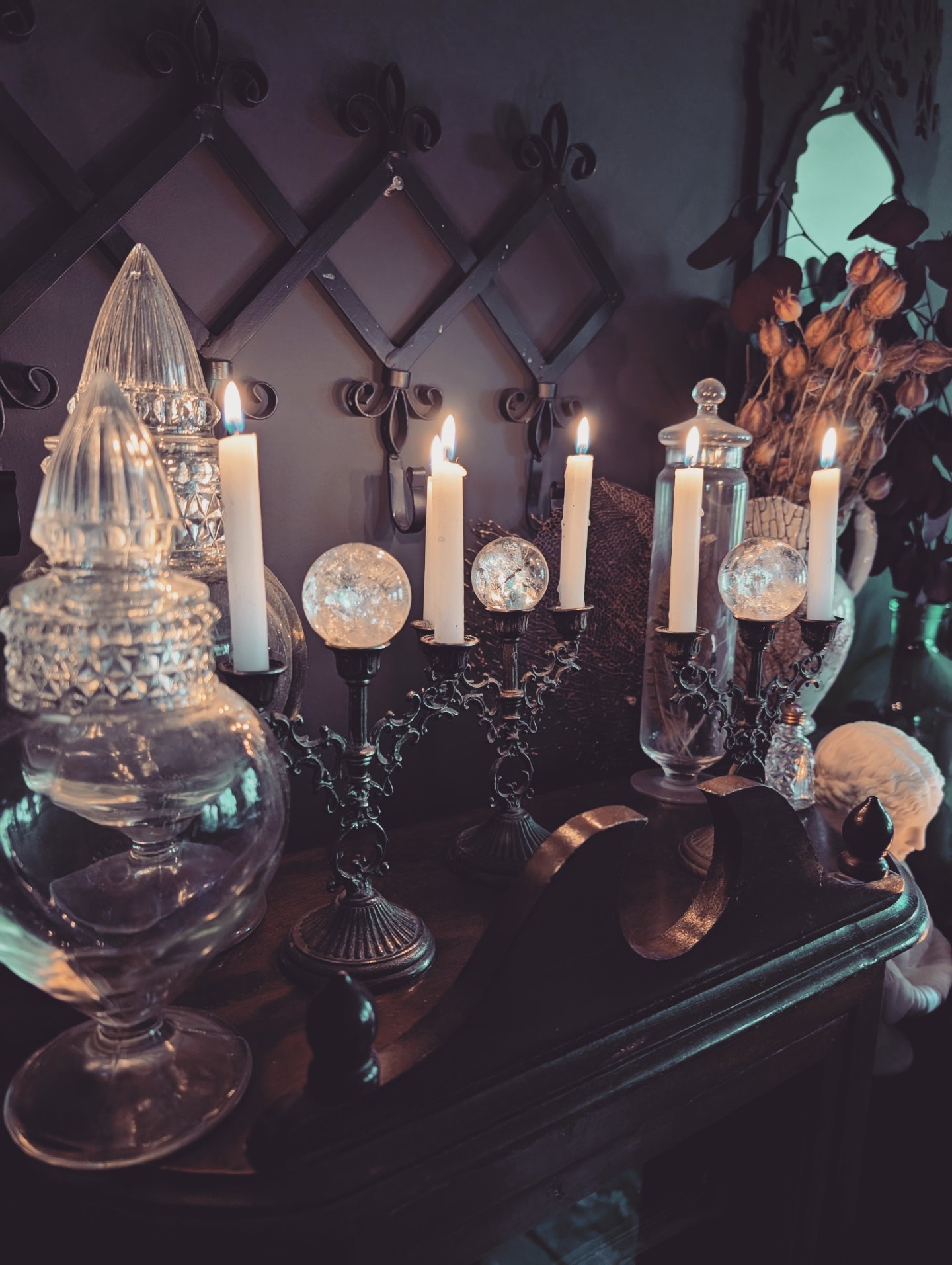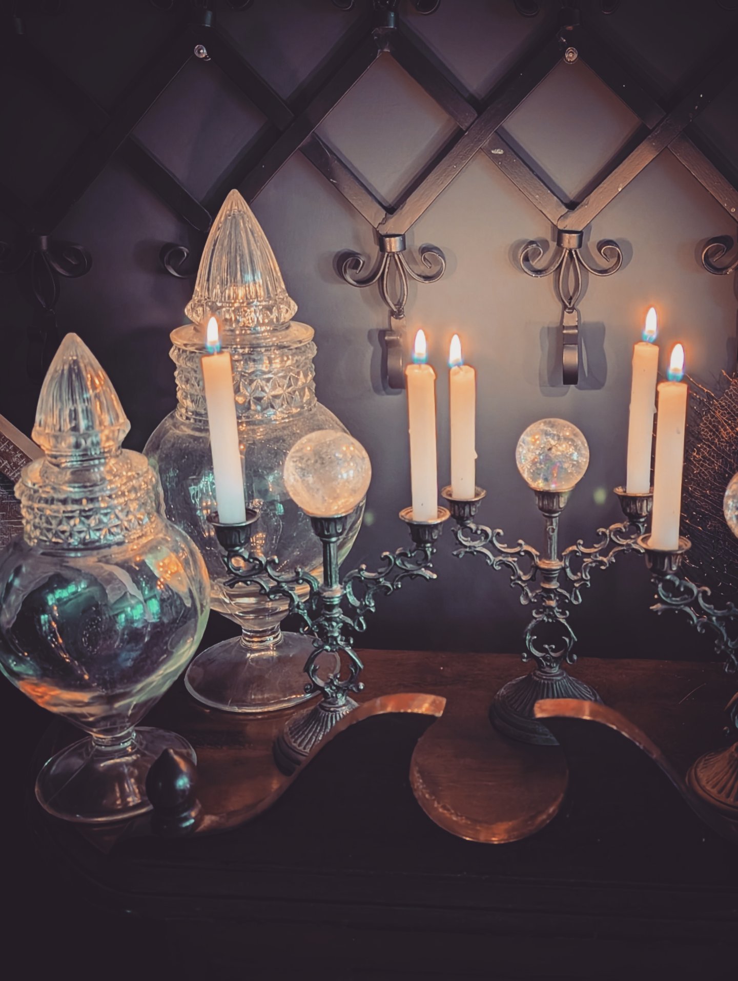 This is a vintage spell candelabra that is 5 in tall by 4 in wide. It also comes with a clear quartz sphere, with rainbows and inclusions, that is about an inch and a half in diameter.