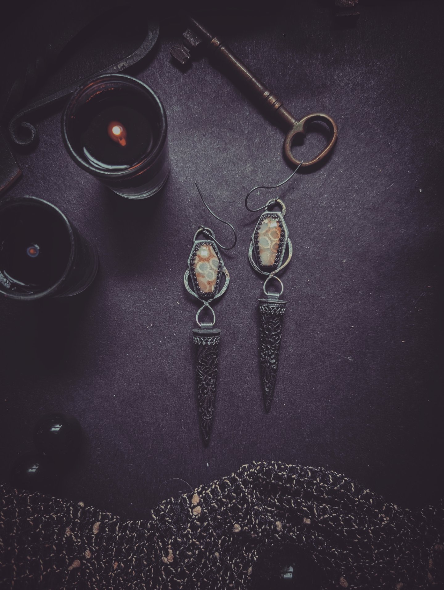 These are handmade and one of a kind. 3.5 in long. all sterling silver. Coral fossil coffins, with carved black horn spikes.