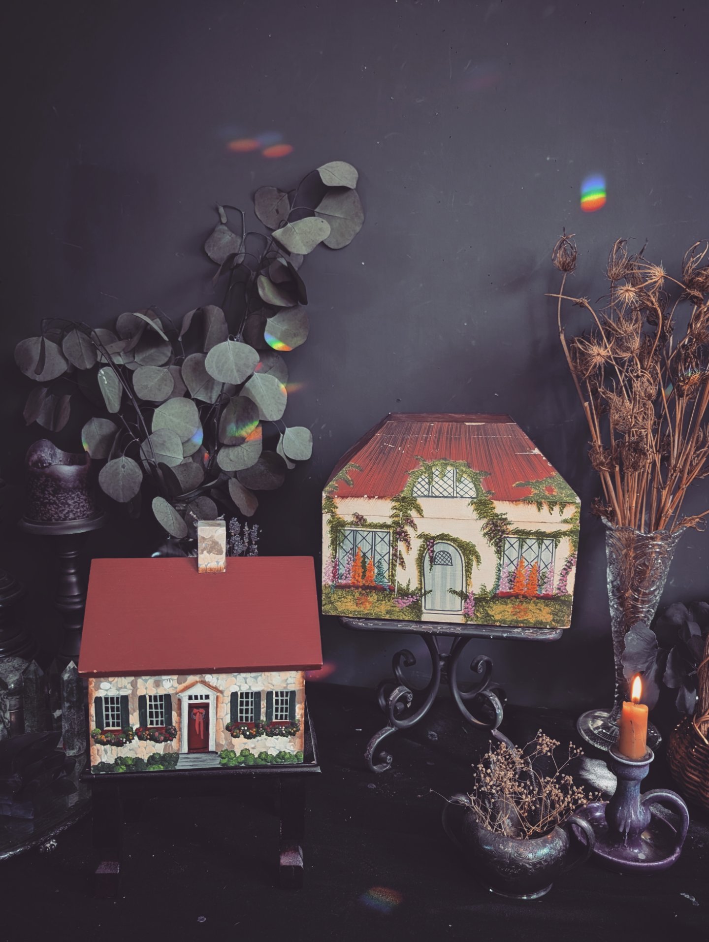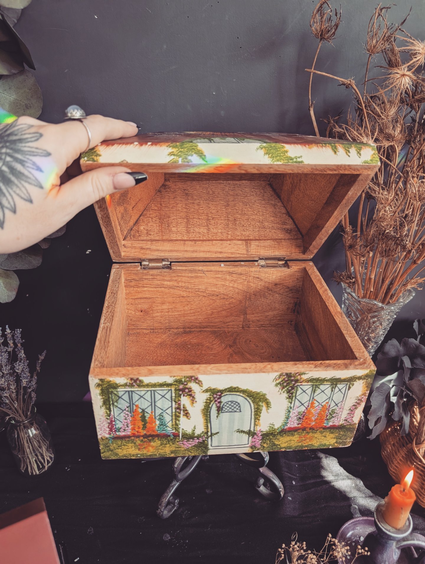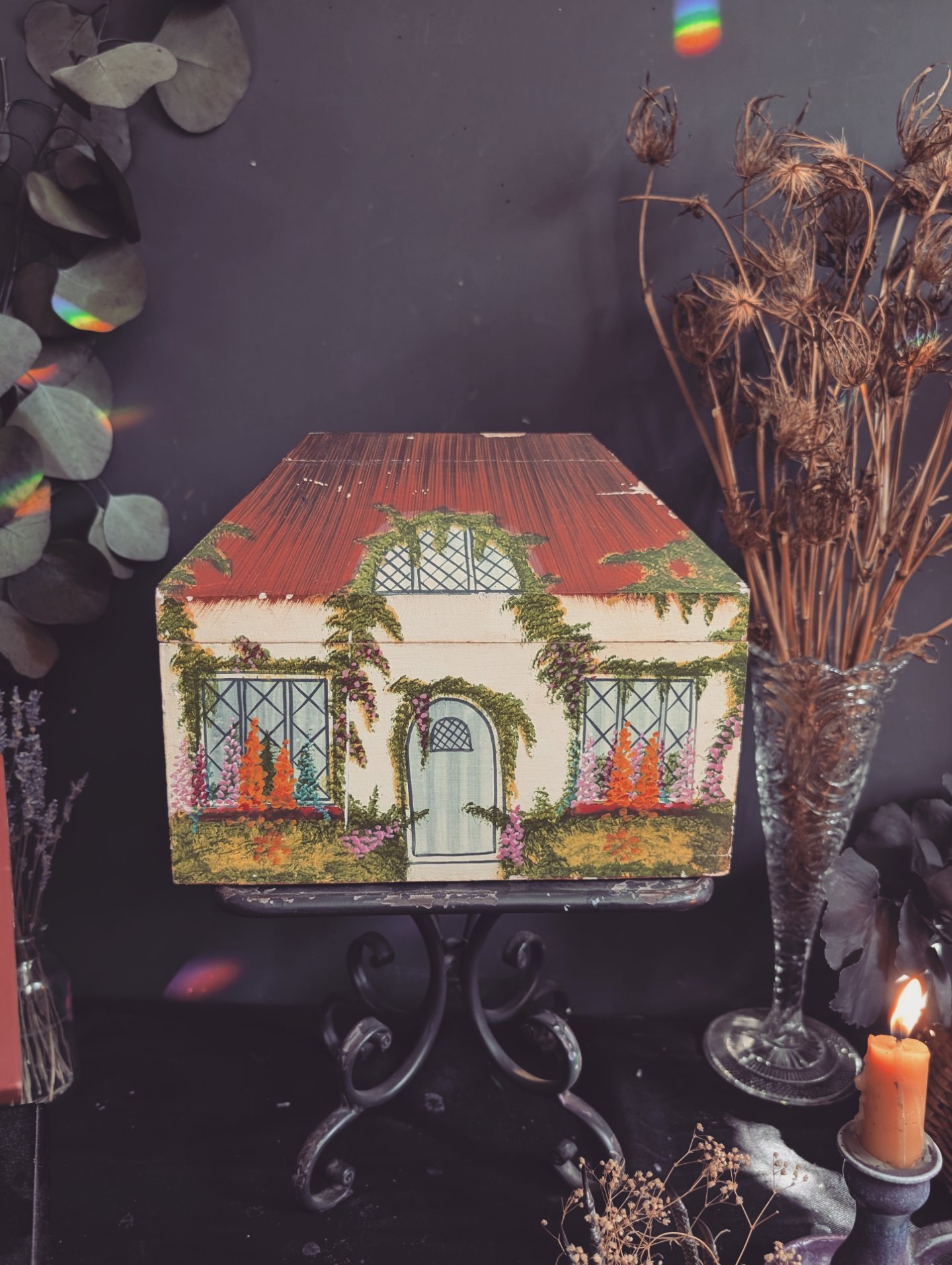 The larger box, which opens on a hinge is nice and colorful. It has a few chips on the roof and on the corners but overall good condition. It measures 9x7x 7