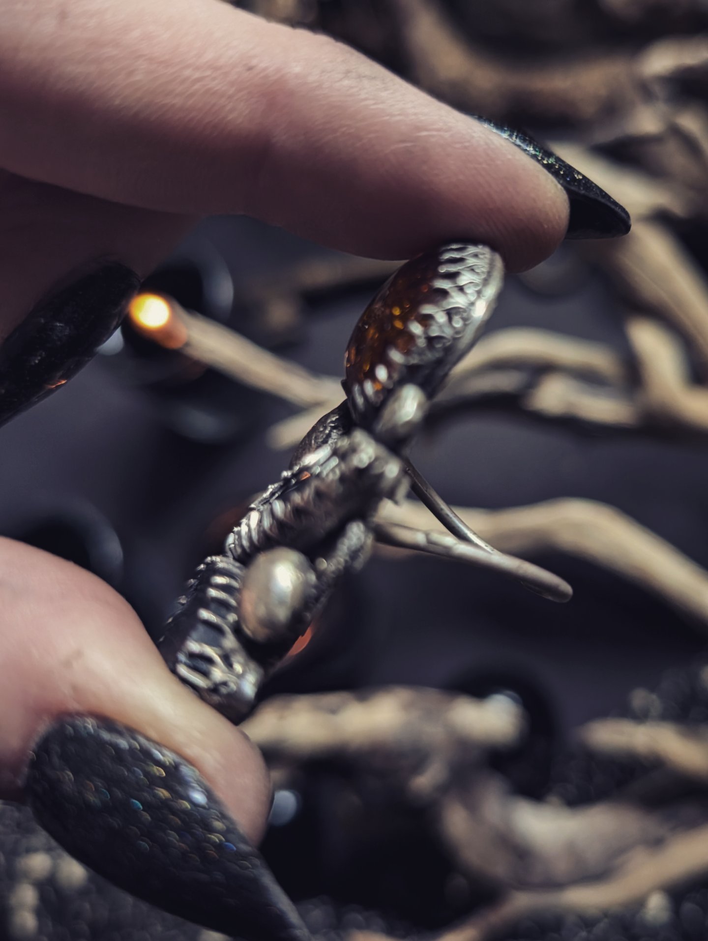This is a handmade one of a kind piece. a vibrant Baltic Amber, a slim hematite, and a raw black tourmaline sit among sterling silver beads and moons. Comes on a thin wire band. Back is pretty open. 1.75 in long. 1 in wide.
