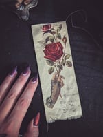 This is a silk ribbon printed with a beautiful image of a rose and a fishnet hand. It has a Christmas greeting and is from the 19th century.