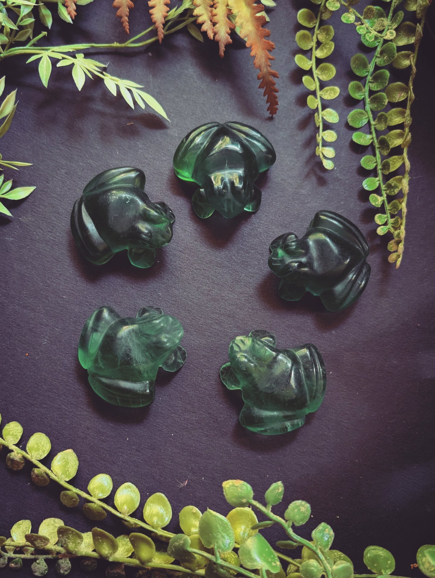 These chunky little frogs are super green in about 2 in each. They fit perfectly in your palm. One will be intuitively chosen for you. They all have a great color.