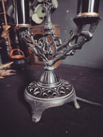 This wonderful antique piece works and it comes with the light bulbs. It measures 13 in tall that includes the light bulbs that are on it and 7.5 wide