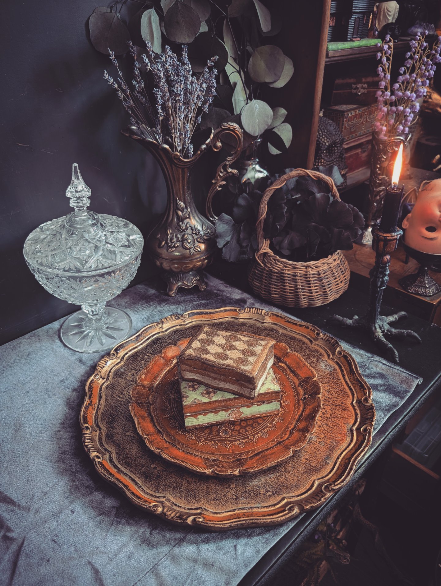 I'm selling the two trays together, and the two boxes together. These are all paper. Mache decorative, metallic gold pieces made in Italy. They make a beautiful addition to any display. Whether it's your altar, your vanity, a table, or your wall.