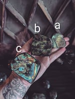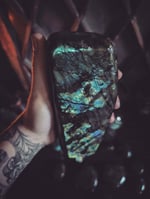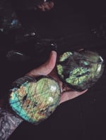 The perfect meditation tool. These large chunks of labradorite great for holding or having on your altar. The labradorite is a beautiful gray stone that has a bright blue green flash and sometimes it comes another colors too. It's very mysterious. It's a stone that comes from Canada and it is excellent for working with intuition and enhancing your psychic abilities. It's also a good stone for protection. It's one of my favorite stones and also I think one of the prettiest and most magical stones that I know of.