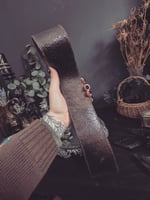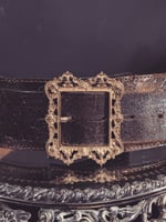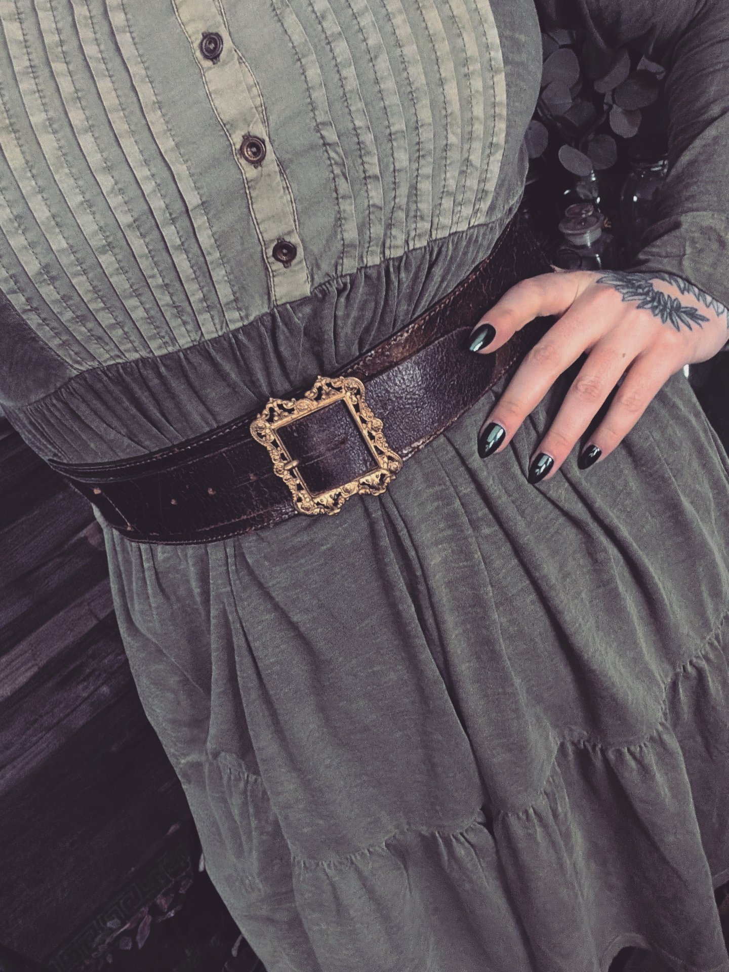 It's a size medium and best fits waist measurement 31 to 35 in. The belt is just over 2 in wide and comfortable. It has a little bit of wear but it's in good condition and would look so cute over a dress. It's very witchy, very Victorian inspired and the buckle is brass