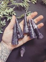 Each is slightly different, but these pretty little purple stands are a nice way to display a special ring. They're about 3 in tall.
