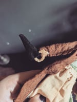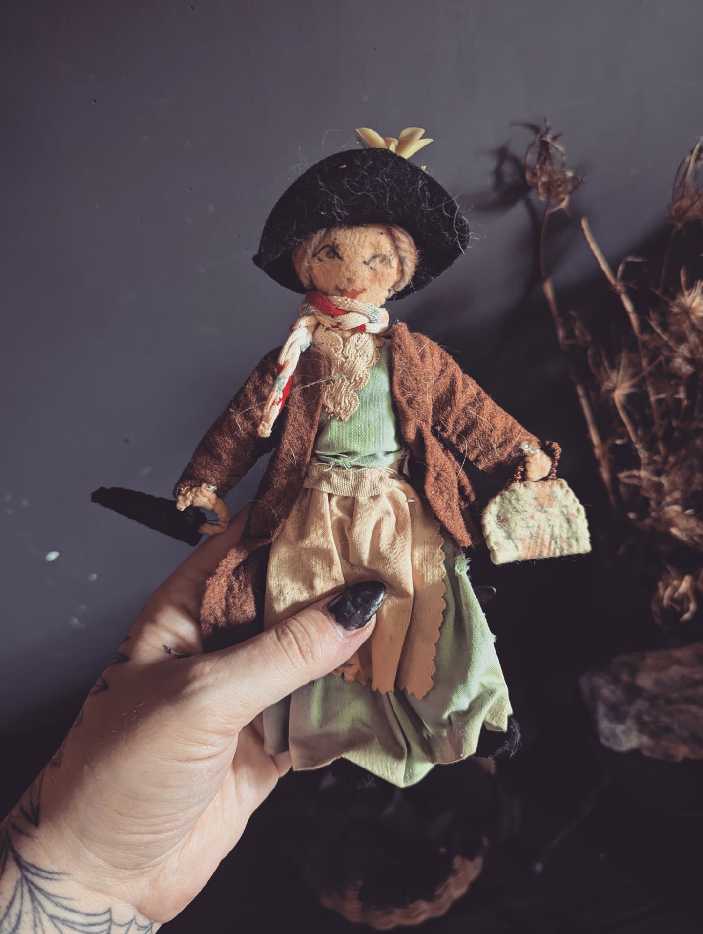 8 in. Handmade. This sweet little vintage doll is all made out of felt and fabric. She has her own little accessories including her carpet bag and umbrella. She's a little bit aware a little discoloration the back of her jacket is ripped but other than that she's very sweet.