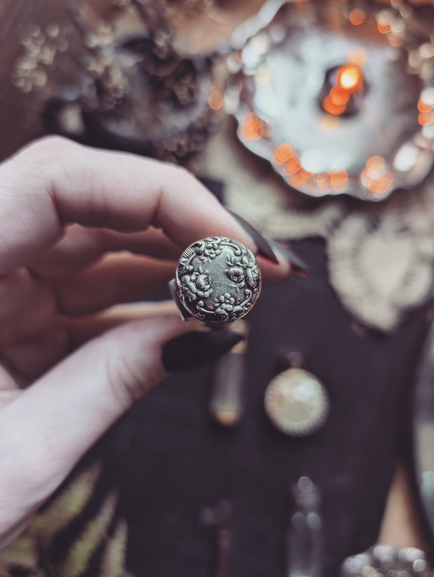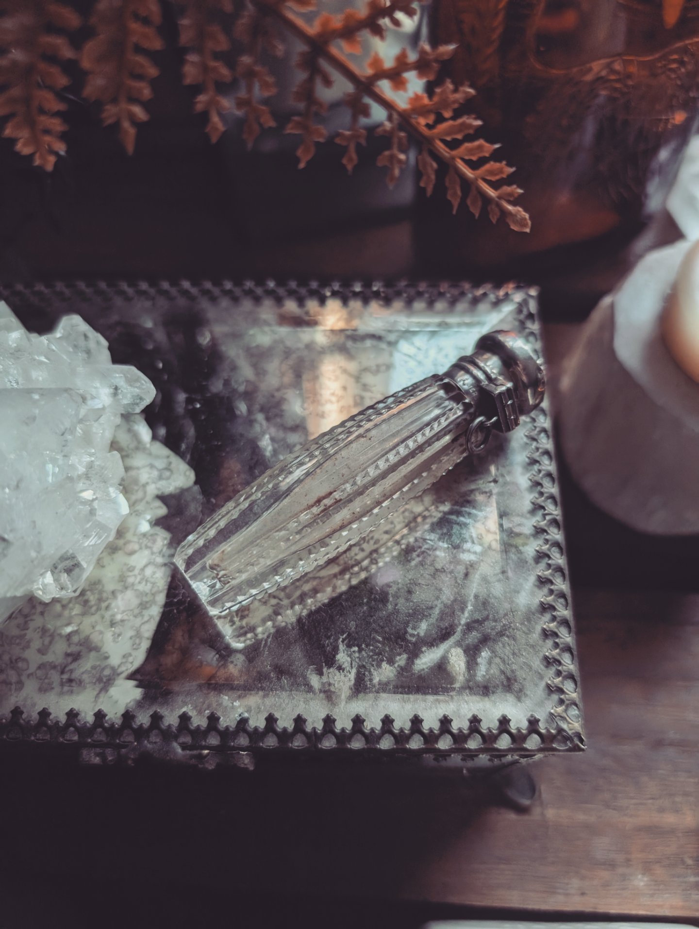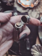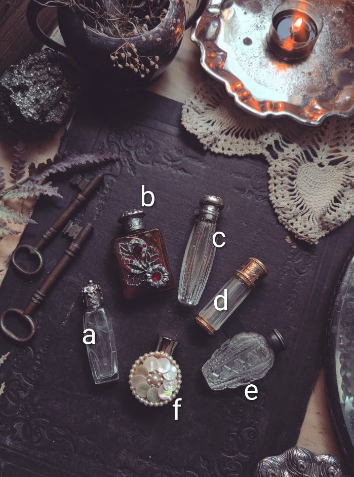 F. This one is vintage. The front has little pearls and shells. The back is brass and it has a screw top with a glass bottle inside. Little bit of tarnish on the lid but overall this is a good condition. It measures 1.5 in