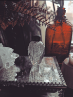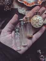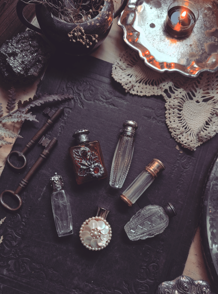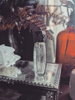 A is a Victorian perfume bottle with a sterling silver top. It is just over 2.5 in tall and it has a glass dauber inside. It's in great condition. It's engraved with little flowers and it's made in France