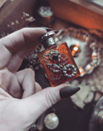 B. B is an orangey red check glass bottle with fun little rhinestones and metal parts on the front with the lid it measures just over 2 in. It's really even prettier IRL