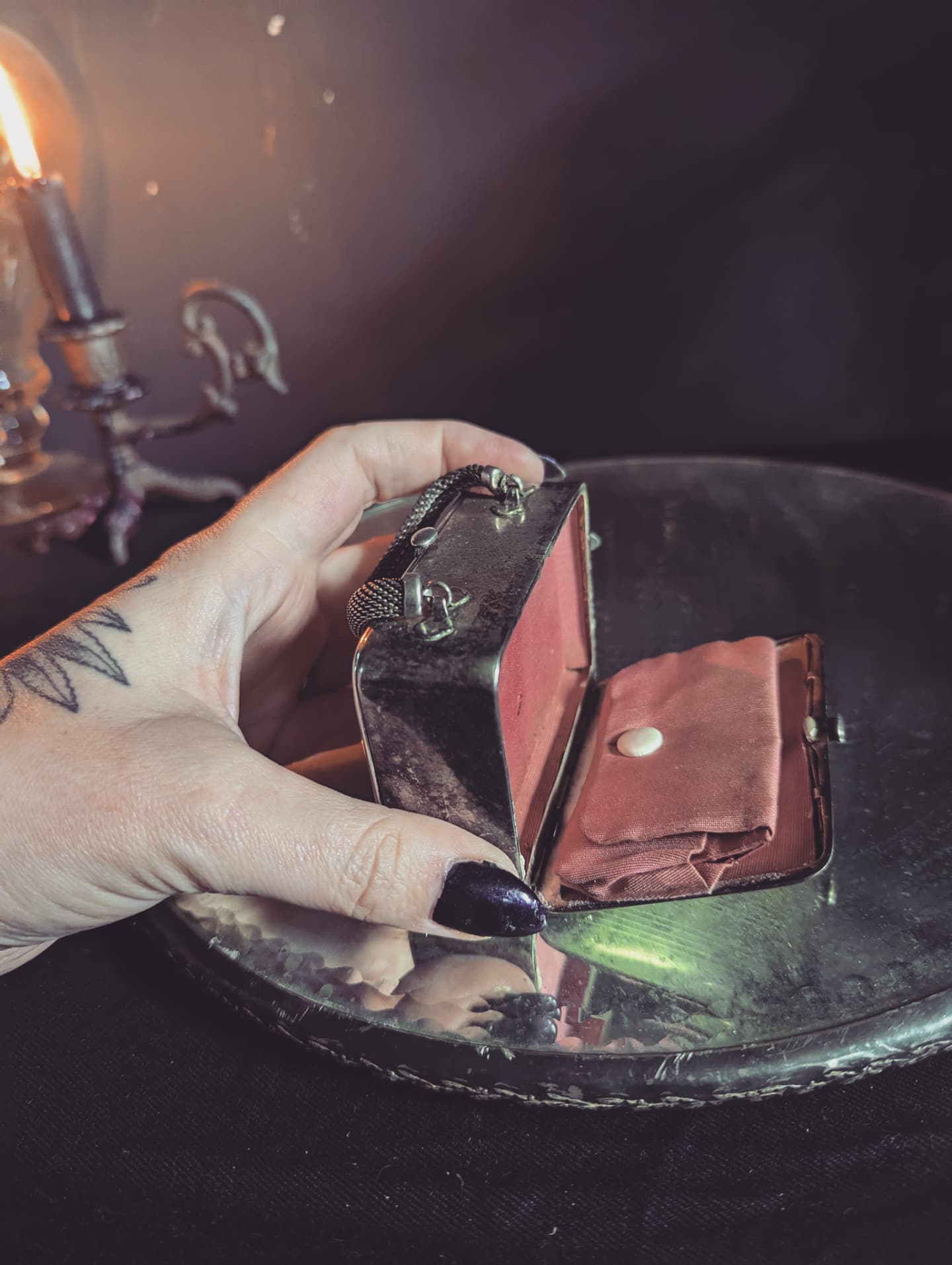 German silver. Antique mini box purse shaped like a suitcase. Has a small perfume bottle and lipstick holder in one side, and a little pouch in the other. A lovely piece for someone who collects vintage vanity items. Has some tarnish and wear