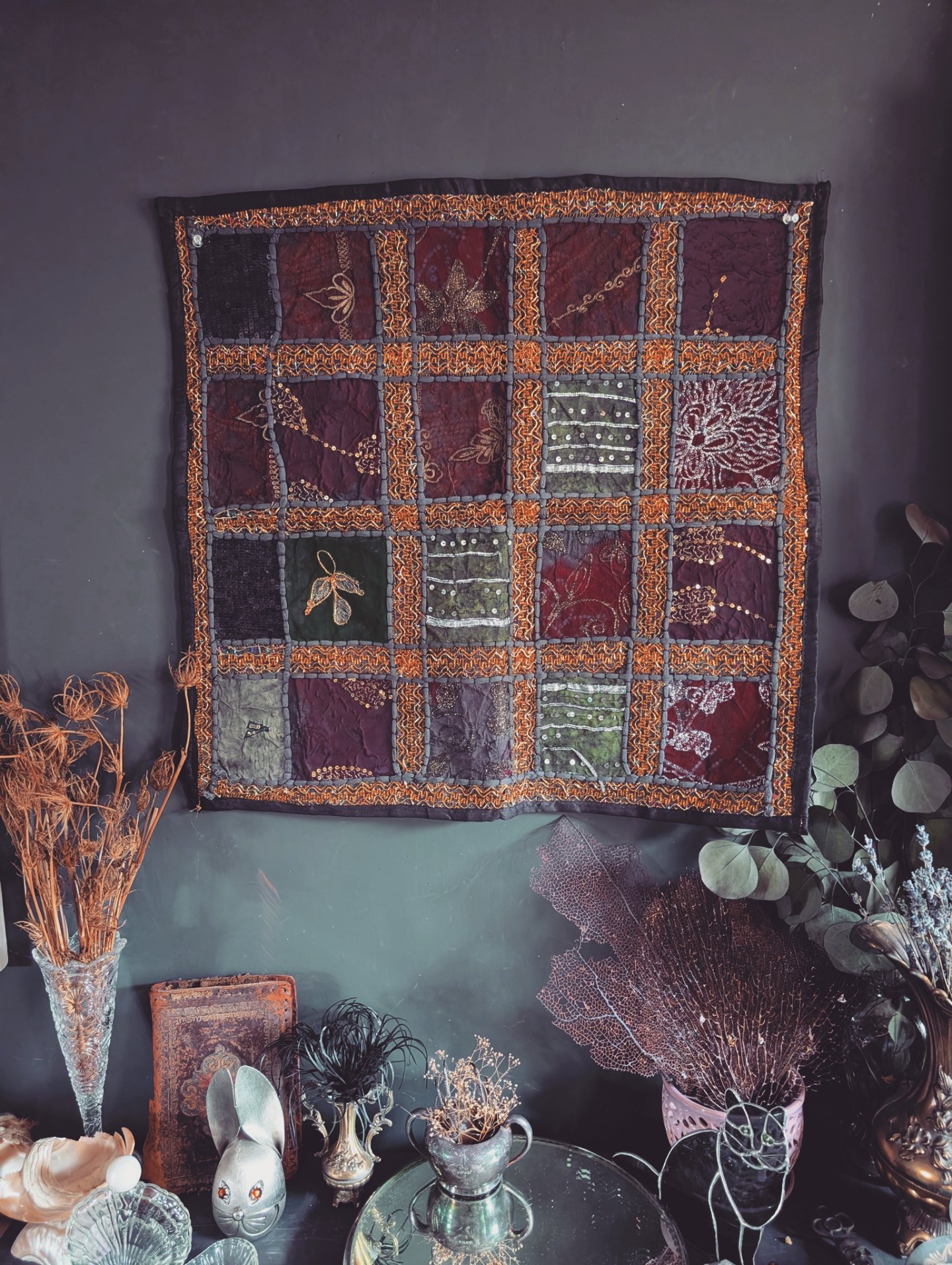 This is actually a pillowcase but I don't think it was ever used cuz it's still really flat so it's easy to just hang up on the wall as a tapestry or this would make a nice altar cloth