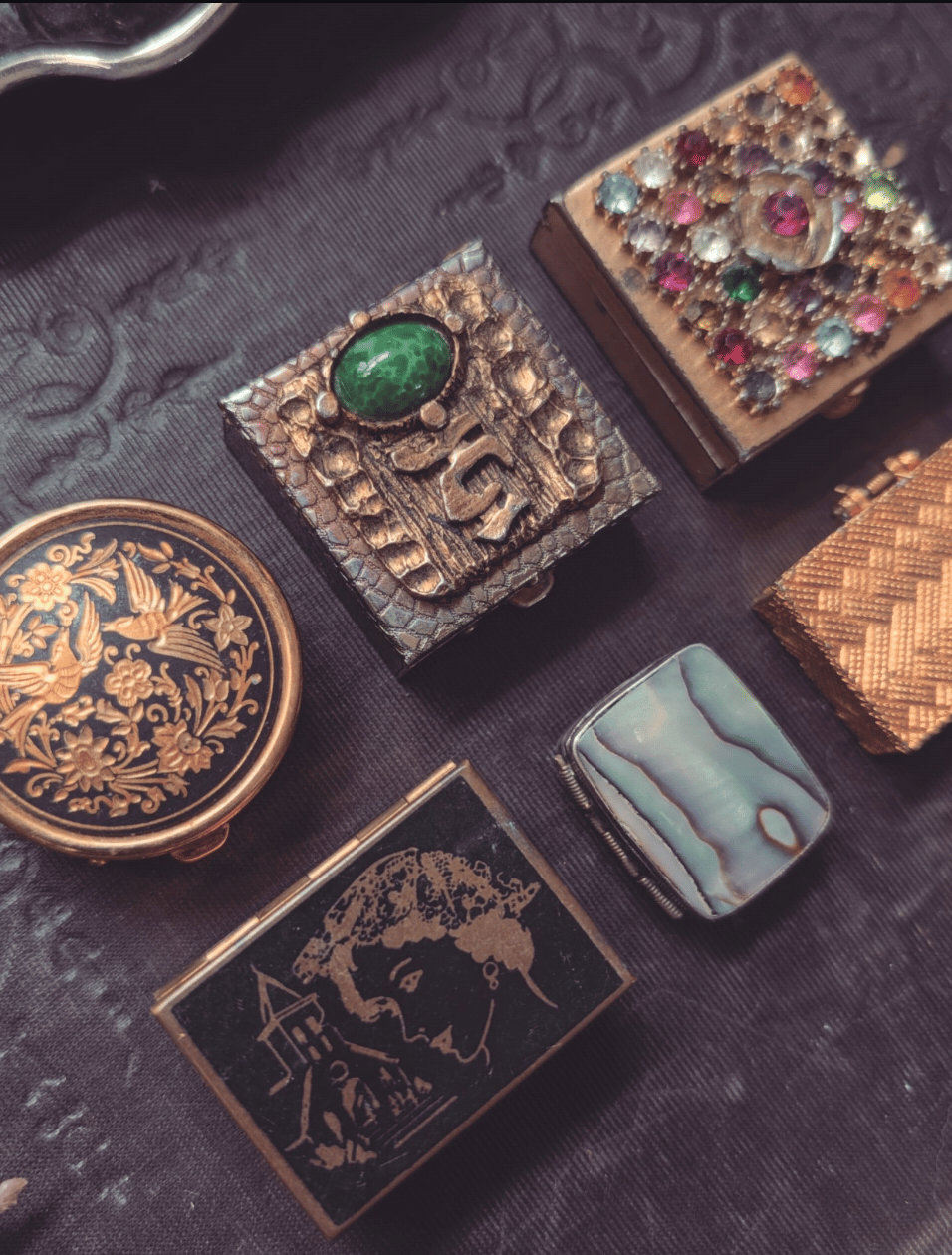 The pill box with the green gem has some tarnish but good condition measures 1 and 1/2 by 1 and 1/2