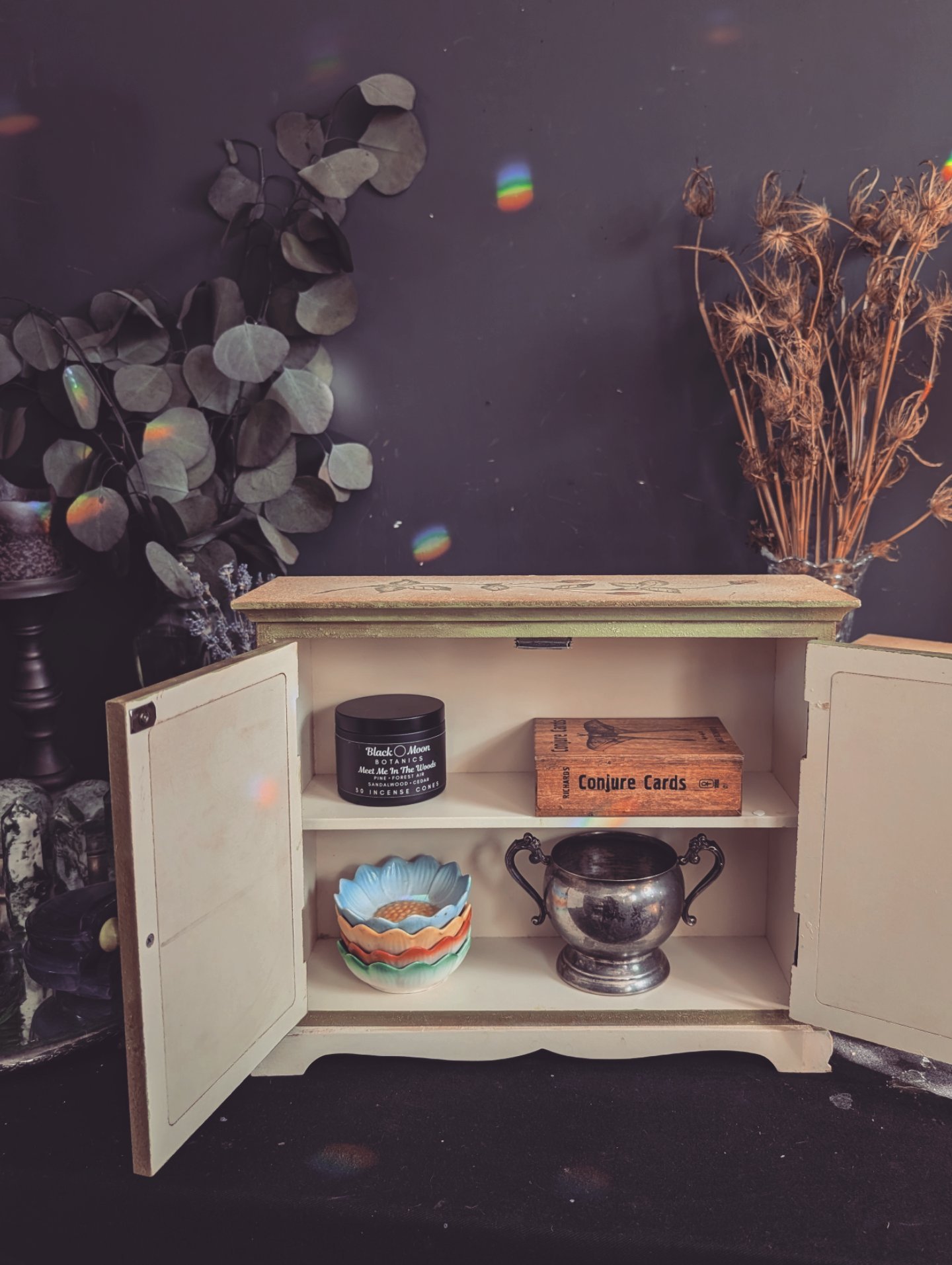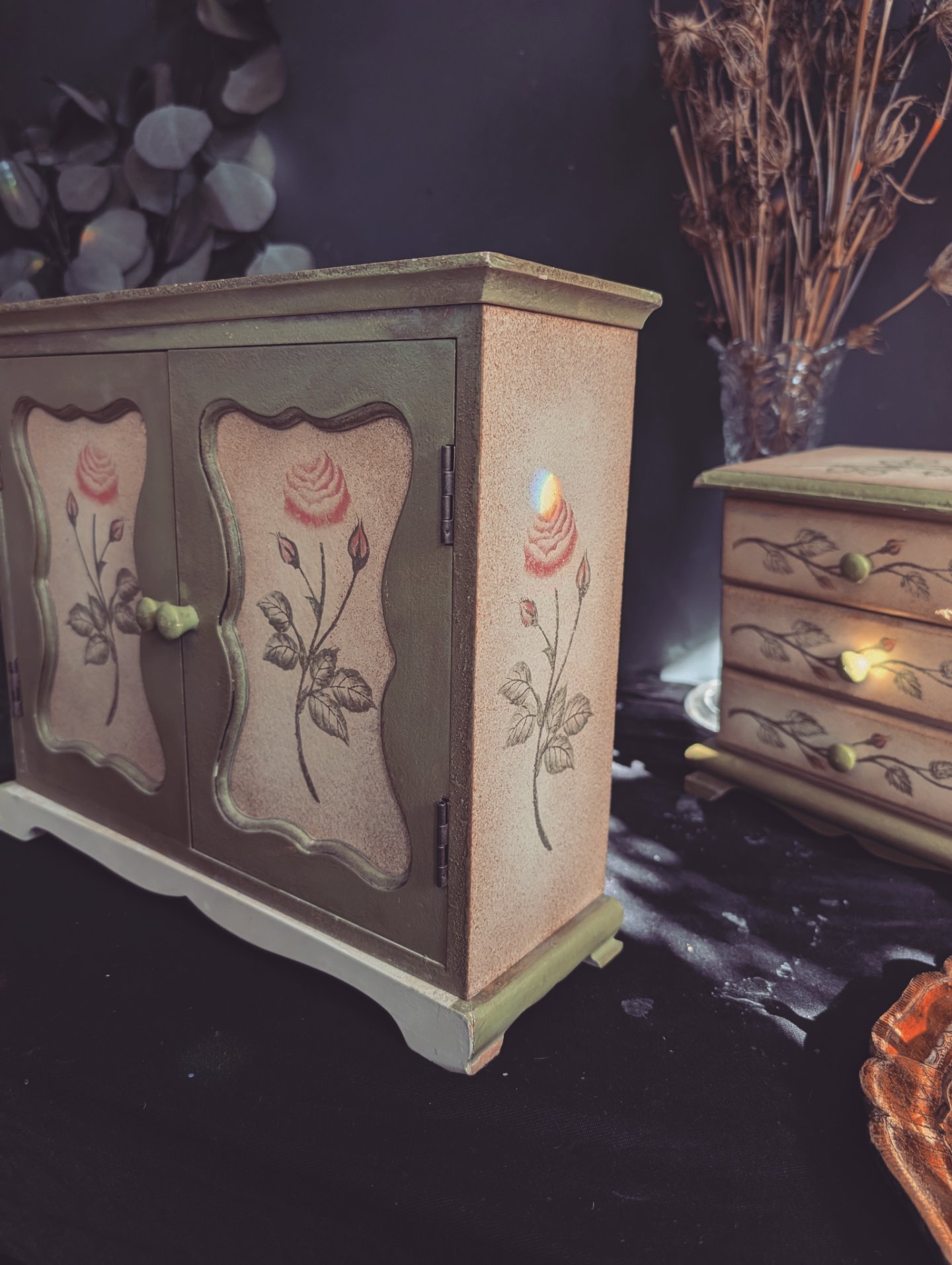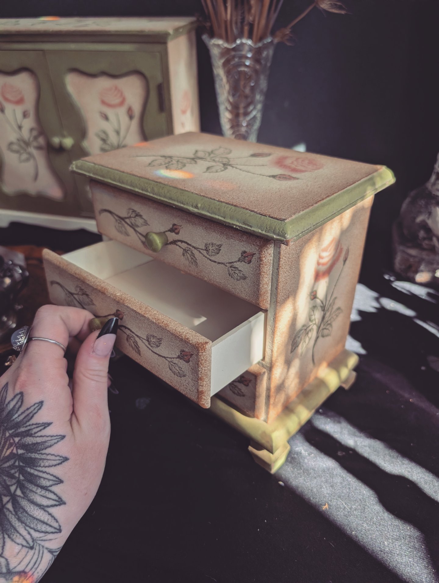 The rose cabinet is perfect for holding special things like tarot cards, perfumes, keepsakes and more. More. It measures 13x x 4.5x 10.5