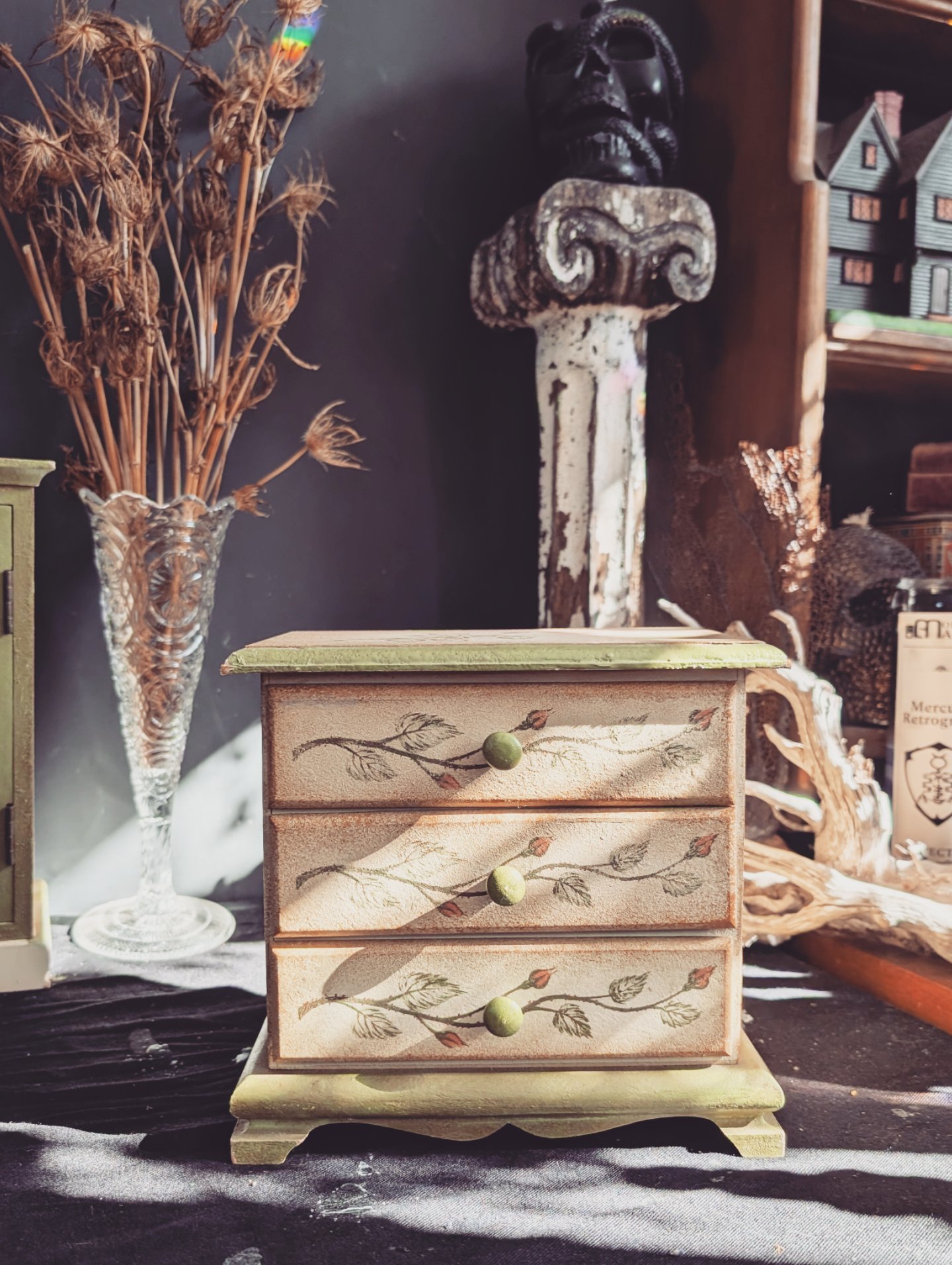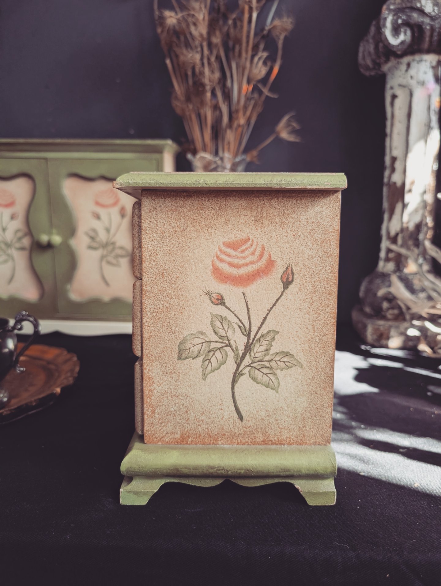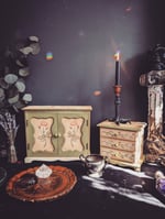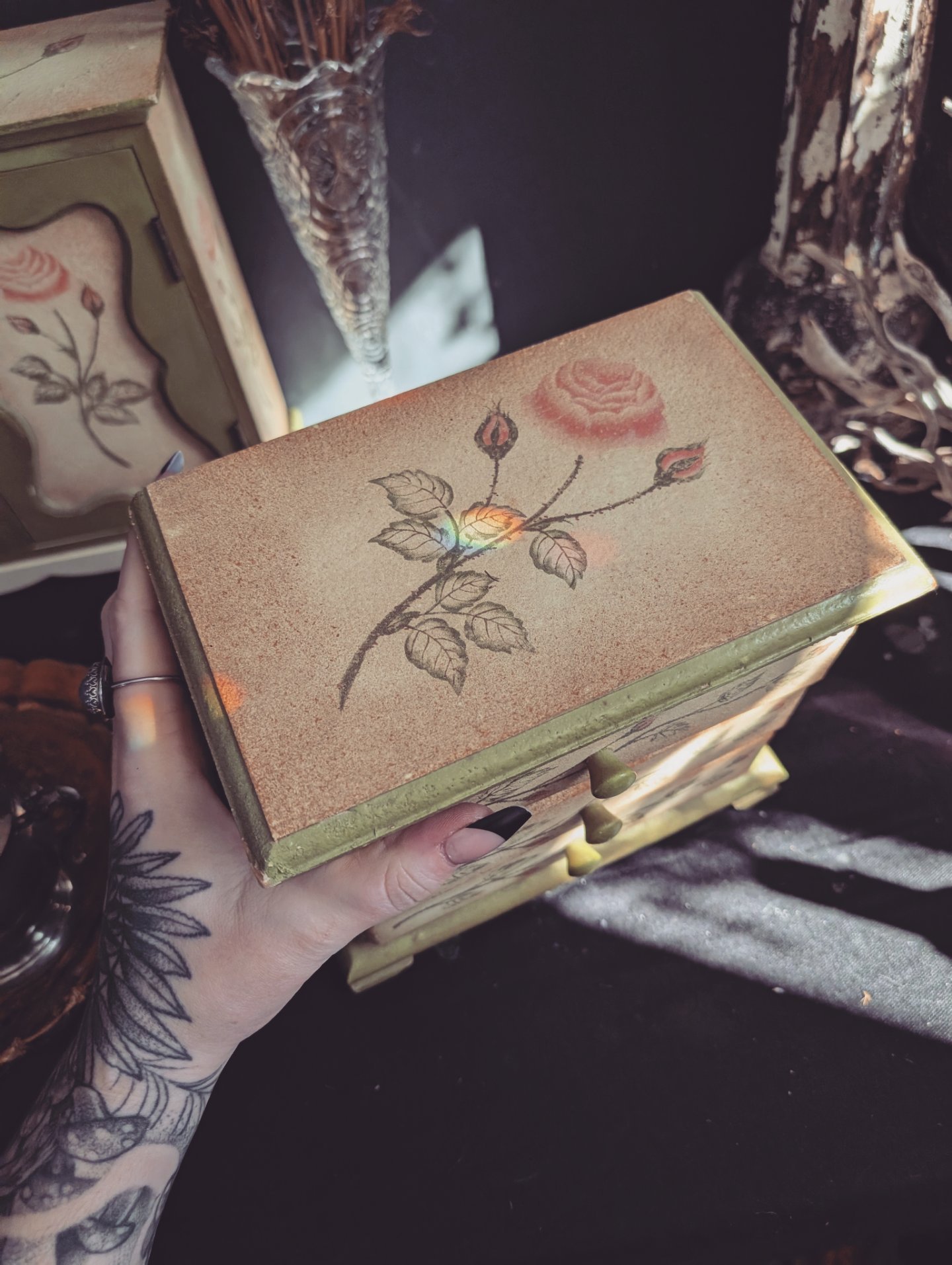 The rose cabinet is perfect for holding special things like tarot cards, perfumes, keepsakes and more. More. It measures 13x x 4.5x 10.5