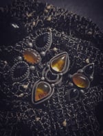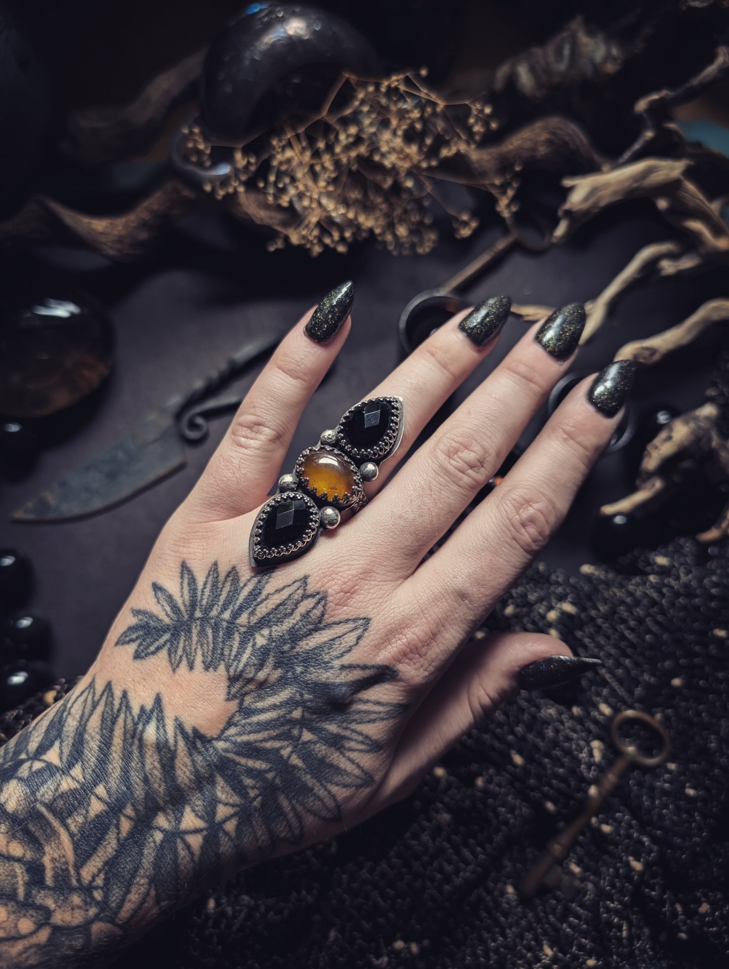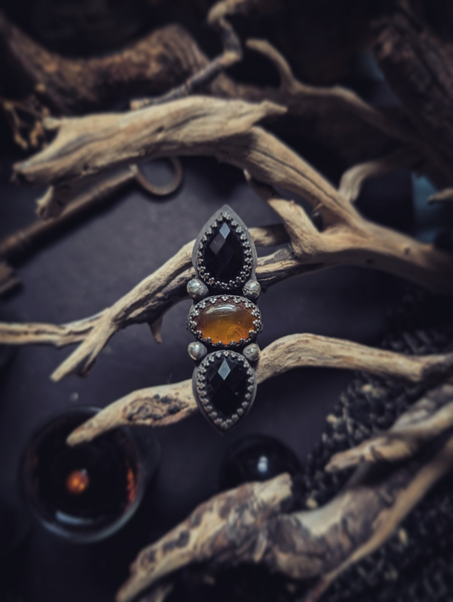 This is a handmade ring. One of a kind. All sterling silver. Faceted black Onyx, with Amber cabochon. comes on a thick floral band. Ring is 2.25 in long