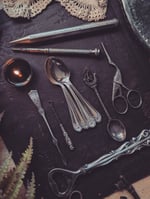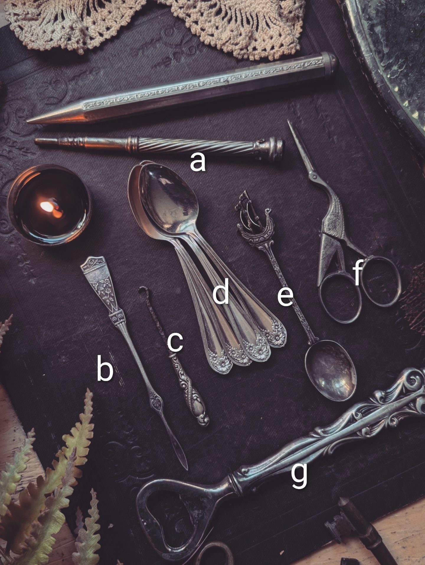 F. Antique sewing scissors. These are stainless steel. The very tip of one side is chipped off but they're still lovely