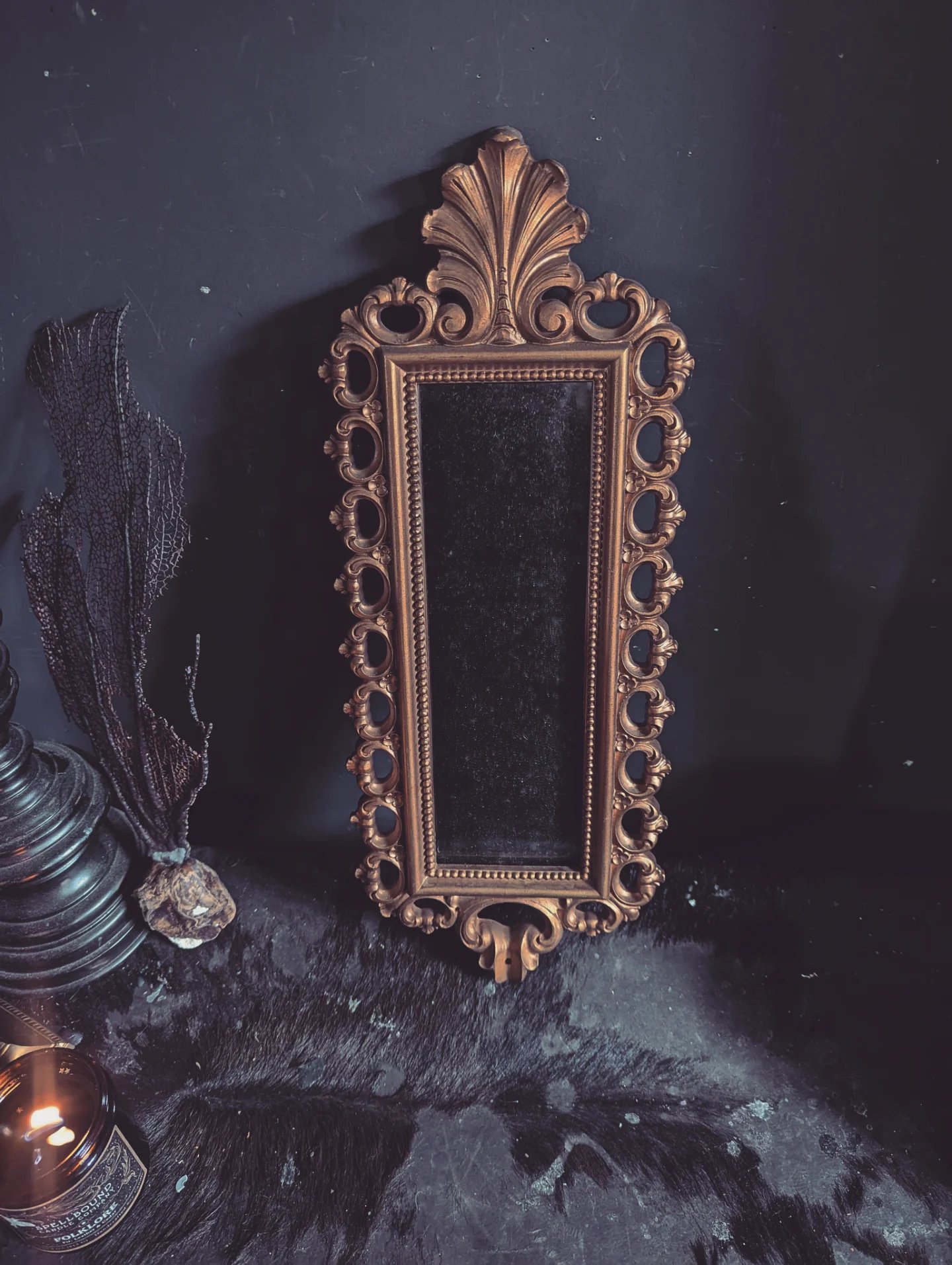 This vintage piece is a grayish mirror with a cool smoky slight pattern. The Frame measures 7x19 in. I have two mirrors available and I'm selling them individually.