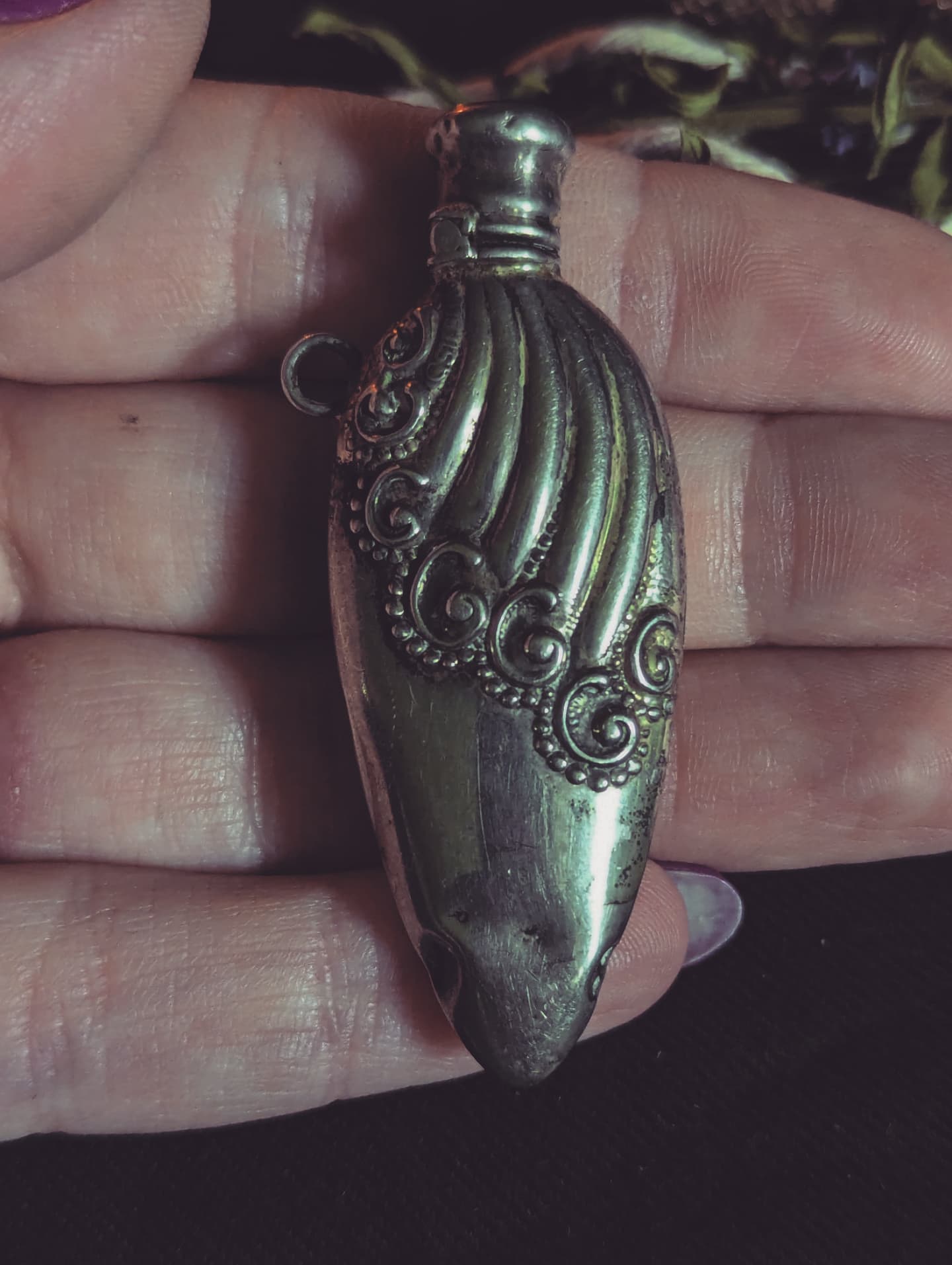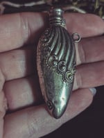 This is an antique perfume bottle. It's sterling silver and it measures 2.25 in. You can wear it as a necklace, or on your chatelaine. As you can see it has some dents in the bottom so I'm selling it discounted for that reason.