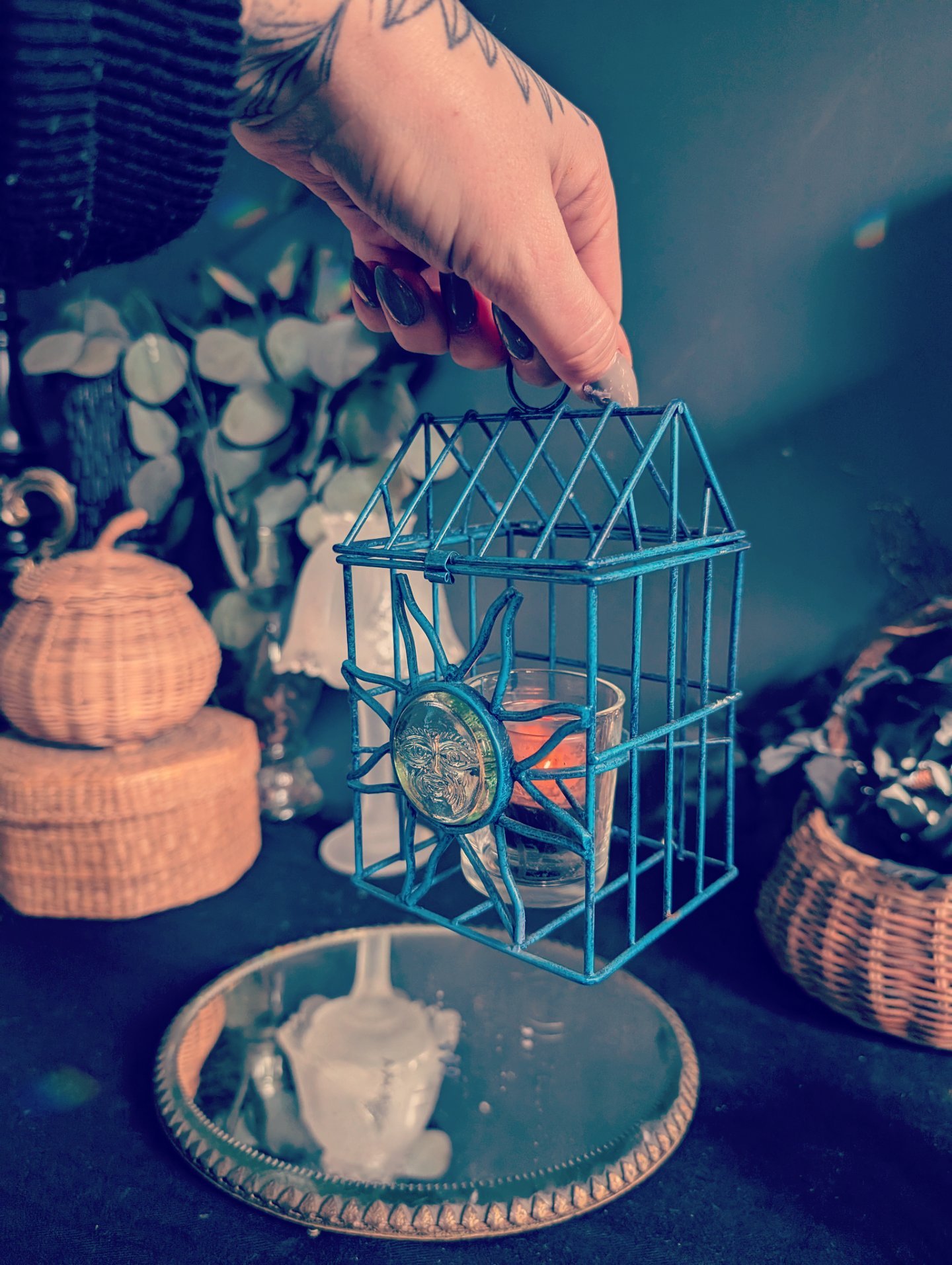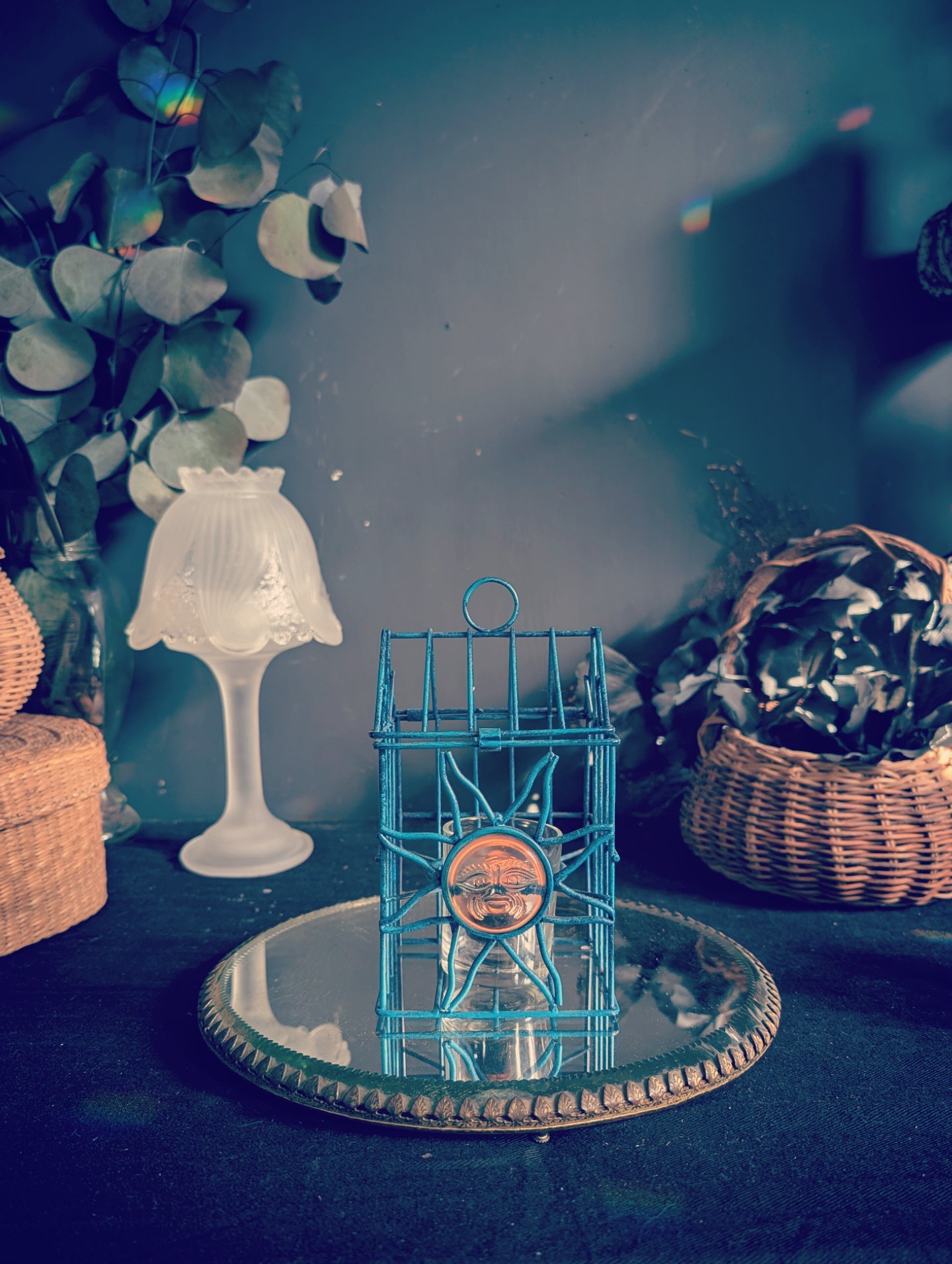 3.5 x 3x 7 in. Metal and glass. Top opens