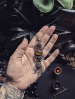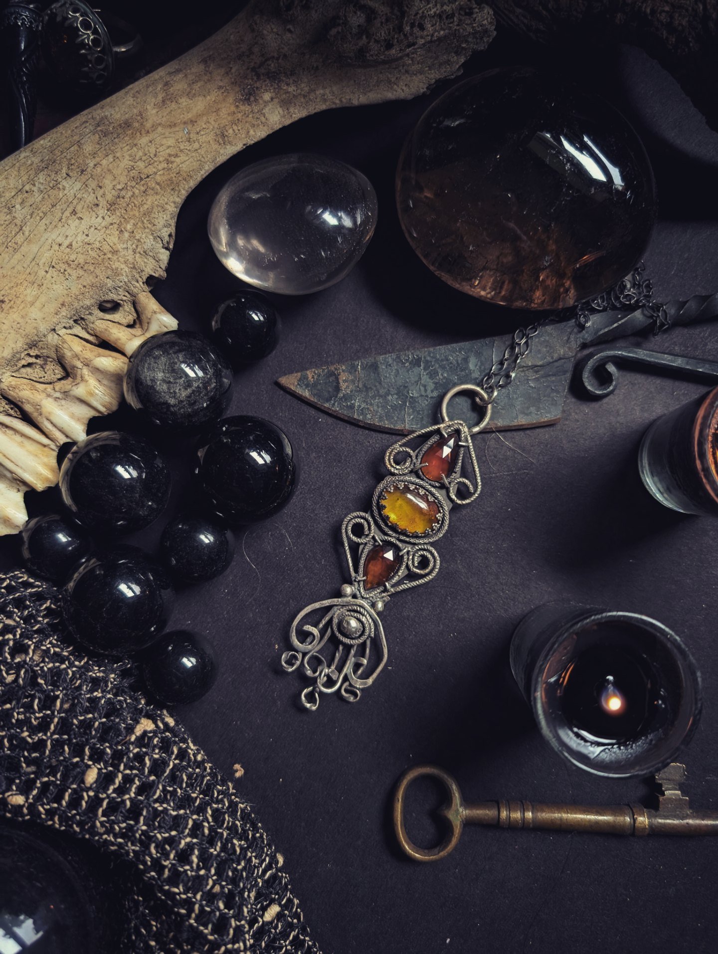 This is a handmade one of a kind piece. Baltic Amber, Hessonite garnets and sterling silver compose this piece. It comes on a 20 in sterling silver chain. Pendant is 4 in long, and pretty lightweight.