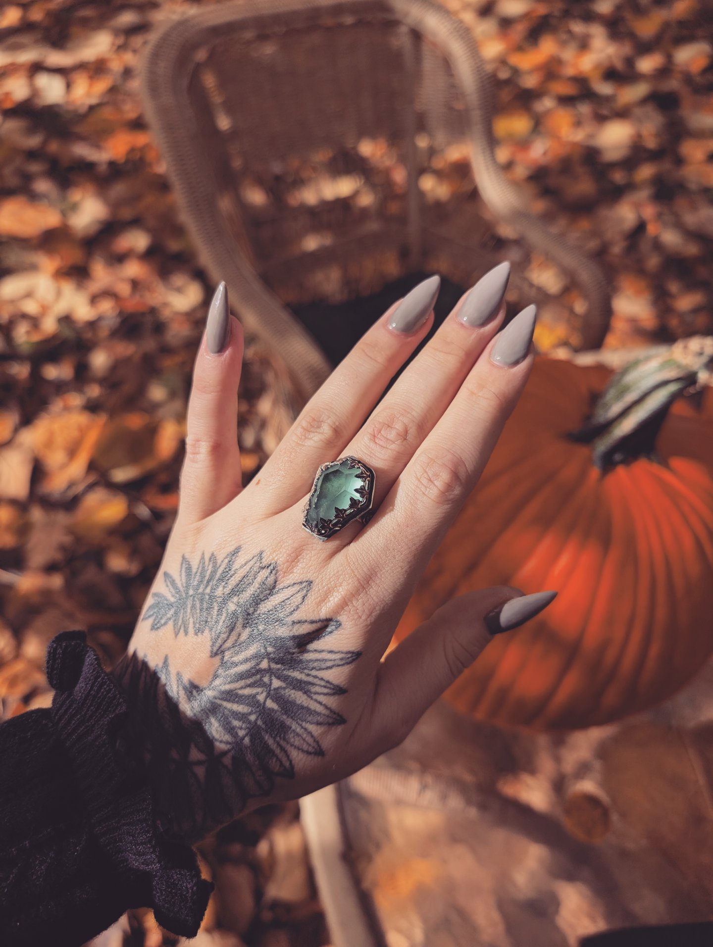 This is a handmade one-of-a-kind piece. All sterling silver this ring contains a high dome pale blue glass cabochon. It catches the light and gives an ethereal glow. Best fits a size 9 comes on a beautiful vintage floral band