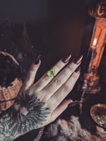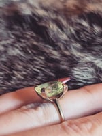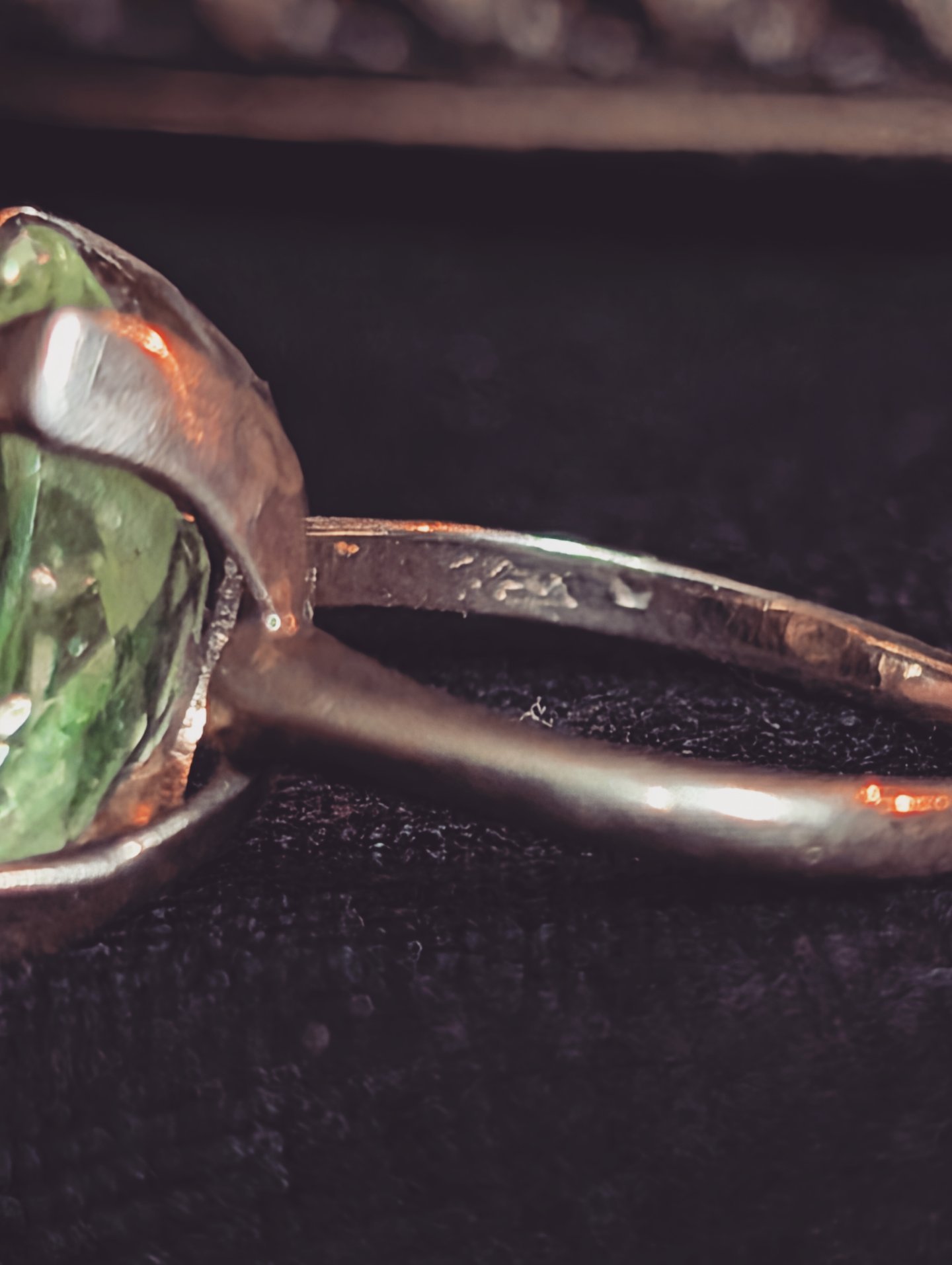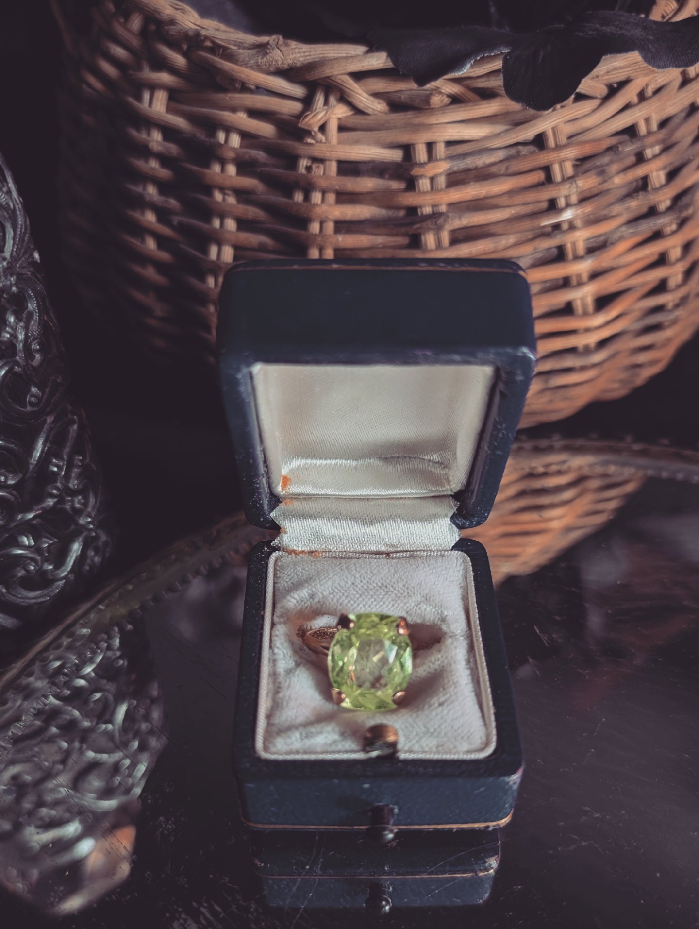 This is a 14 karat gold antique ring. The stone is uranium glass and it glows very brightly. It is marked in good condition and comes with the box.