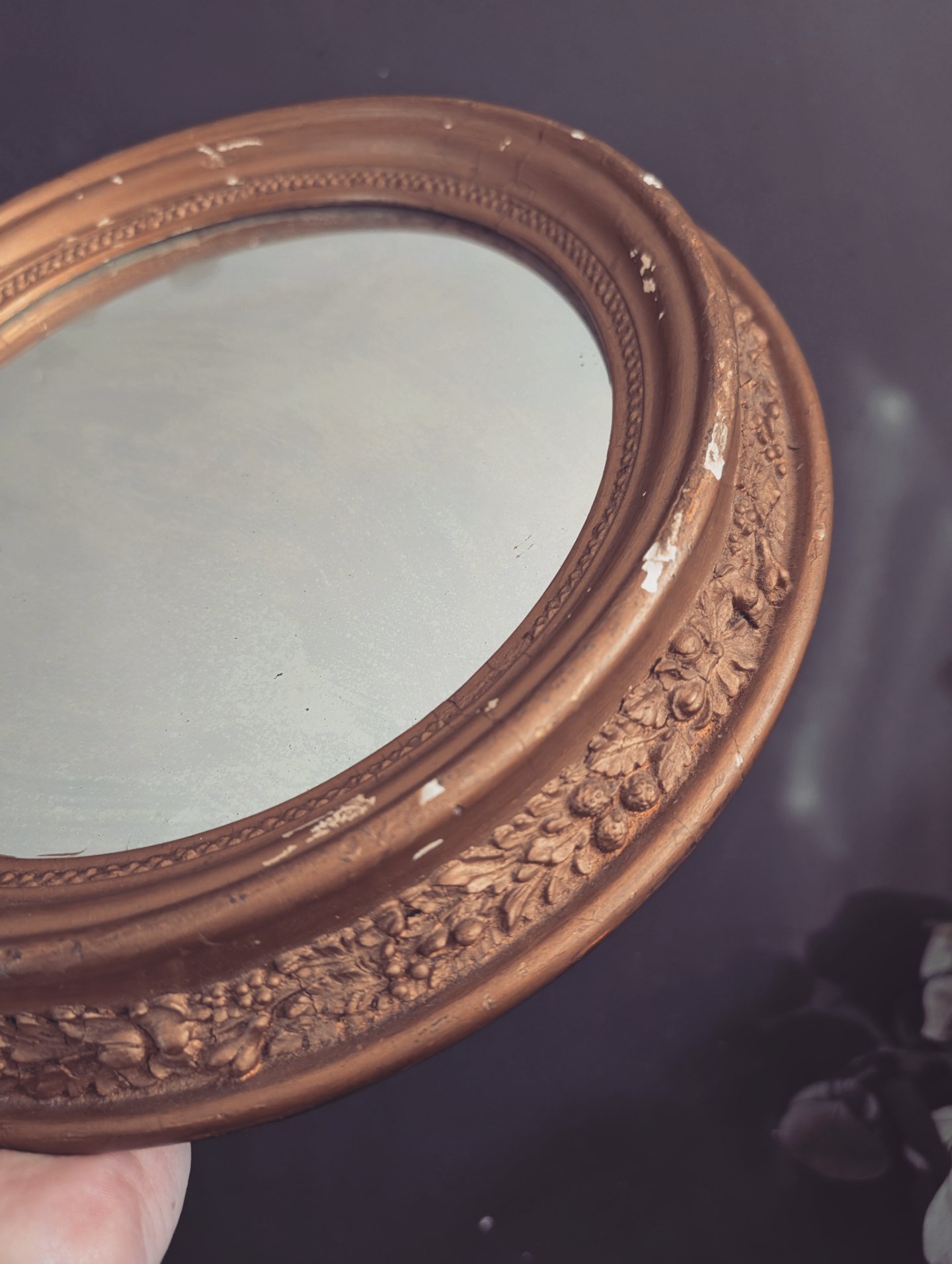 This is a thick wooden frame with a mirror inside. Easy to hang. It measures 13 in wide and the inside of the frame where the mirror is is 9 in. Has a wire on the back. There is some damage along the frame so I'm selling it discounted but I think this is a great piece that you can hang or use as a tray cuz it's quite sturdy.