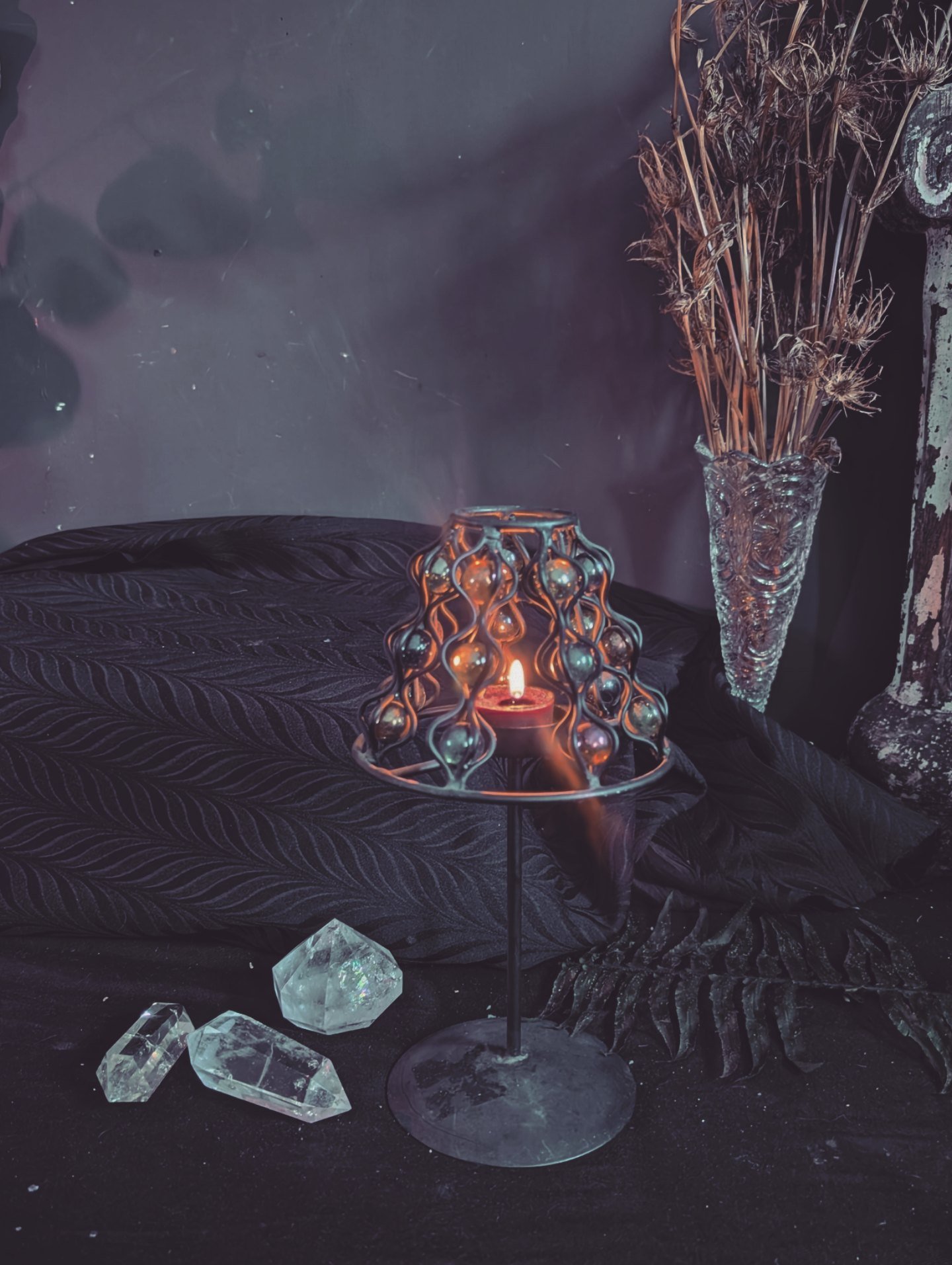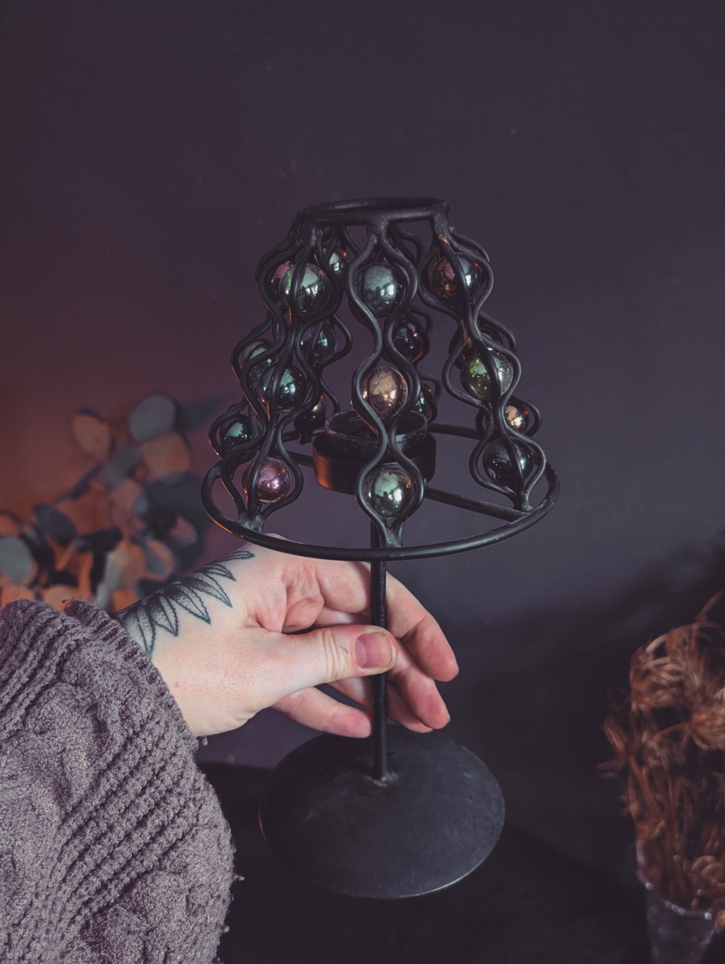 10 in tall. Iron, with multicolor glass marbles in the lampshade. They hold a tea light candle which you have to stick in from the side because the lampshades don't come off of these but they're nice and sturdy. I have two available selling them individually